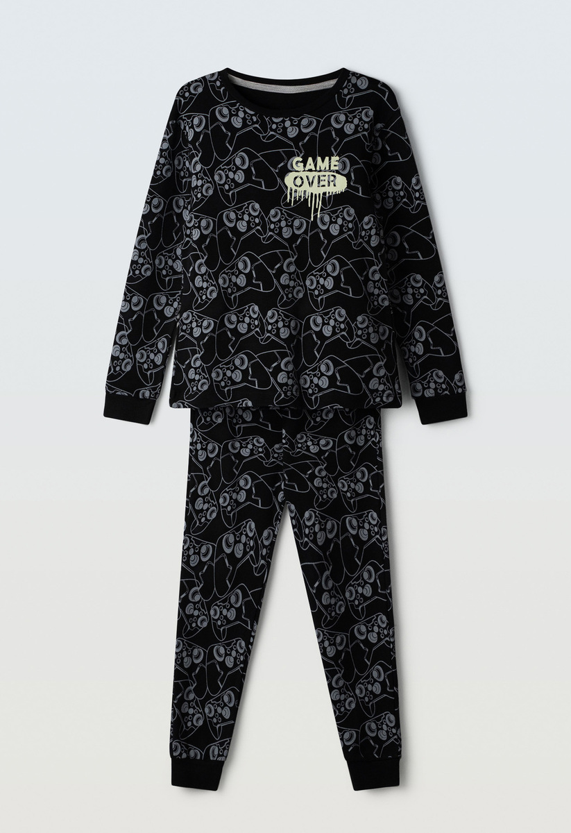 Πιτζάμα HOMMIES, μπλούζα με στρογγυλή λαιμόκοψη, all over τύπωμα, και παντελόνι με λάστιχο στη μέση και το τελείωμα σε χρώμα μαύρο.