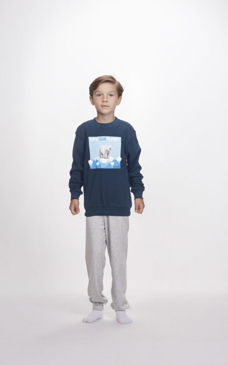 Πιτζάμα DREAMS, μπλούζα βαμβακερή σε μπλε σκούρο χρώμα με ανάγλυφο τύπωμα και παντελόνι βαμβακερό σε χρώμα γκρι με λάστιχο στη μέση και το τελείωμα.