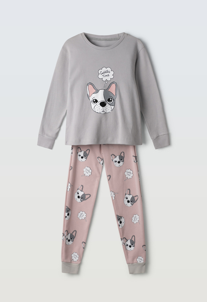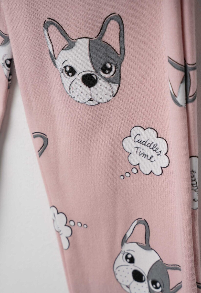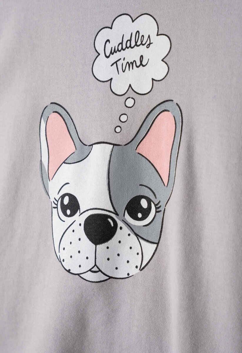 Πιτζάμα HOMMIES, μπλούζα βαμβακερή με ανάγλυφο τύπωμα σε γκρι χρώμα, και παντελόνι βαμβακερό με all over τύπωμα σκυλάκια σε χρώμα ροζ.