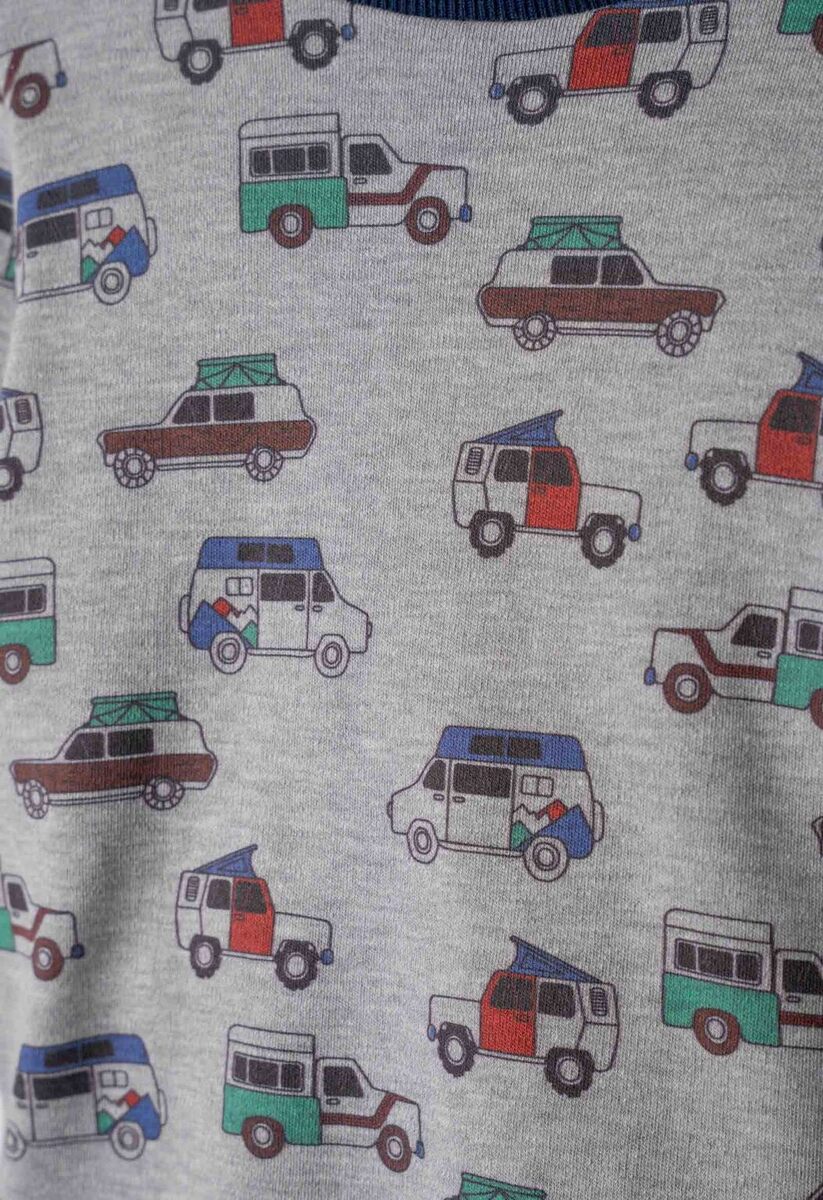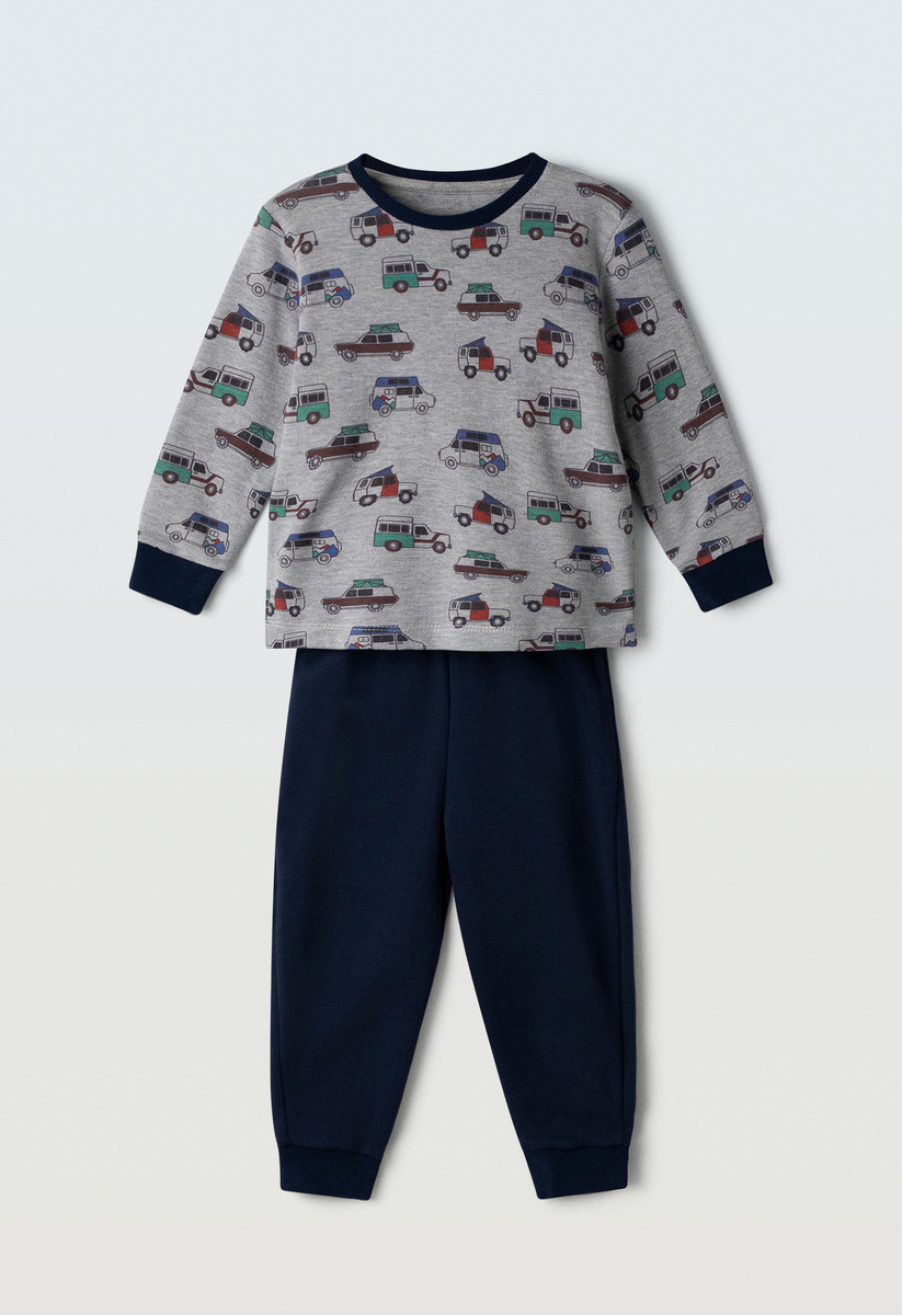Πιτζάμα HOMMIES, μπλούζα βαμβακερή σε γκρι χρώμα με all over τύπωμα αυτοκίνητα και παντελόνι βαμβακερό με λάστιχο στη μέση σε χρώμα μπλε.