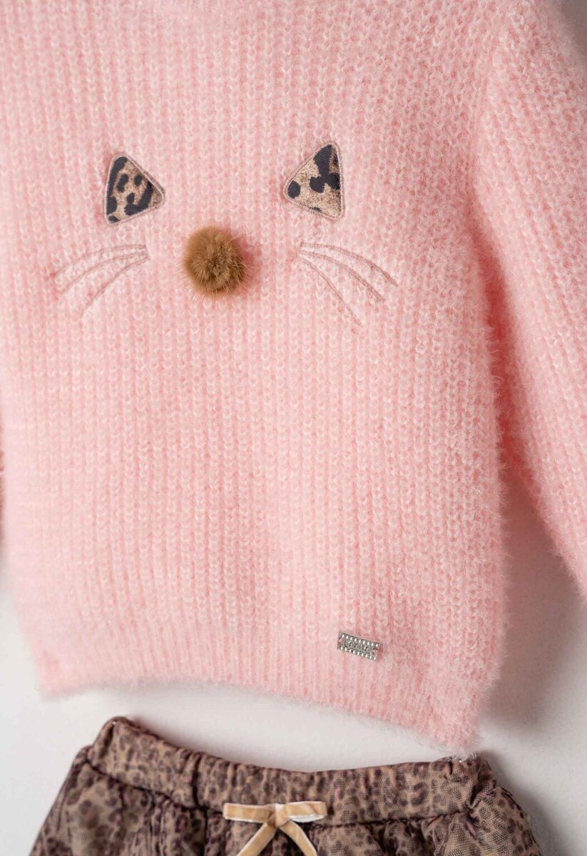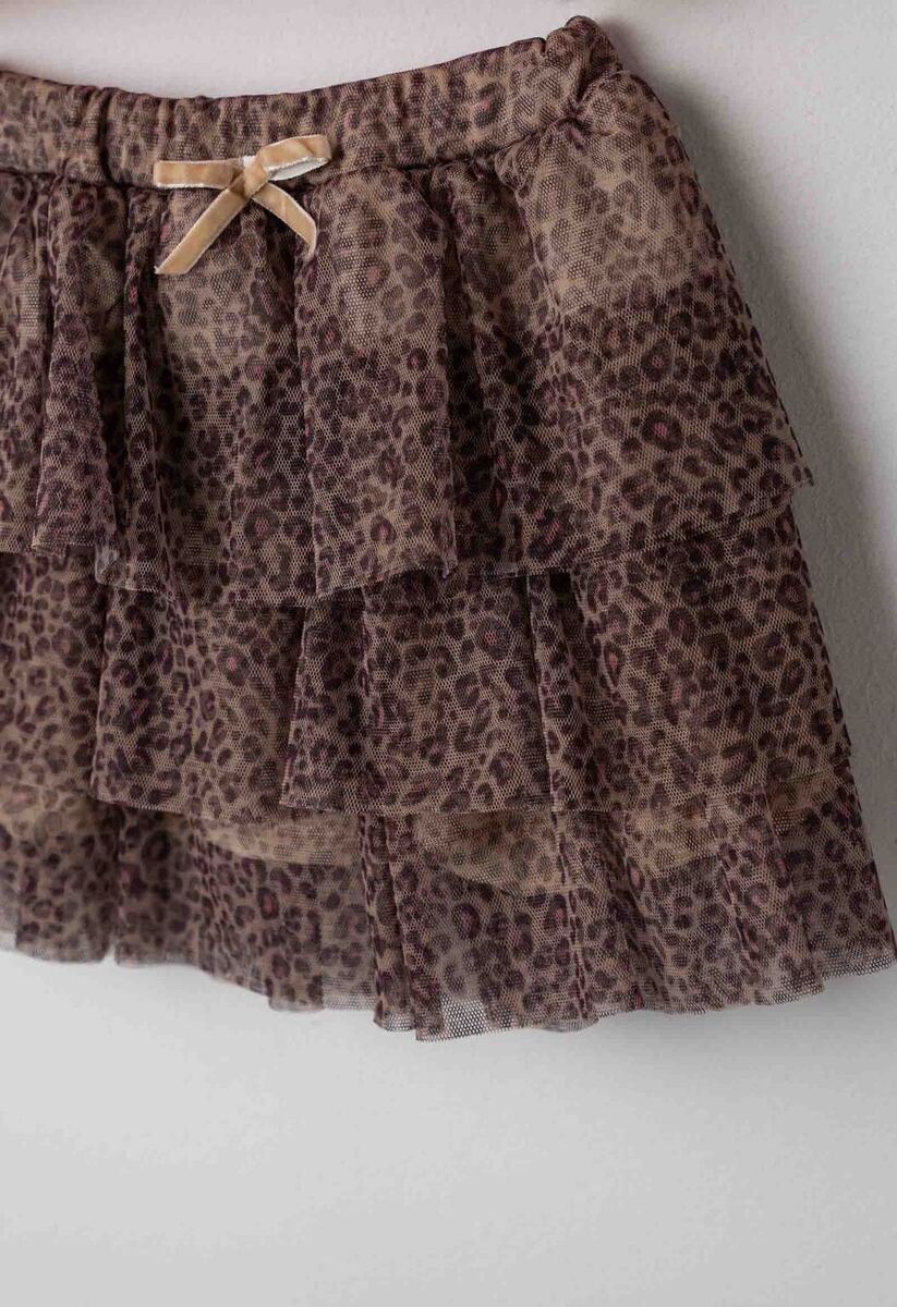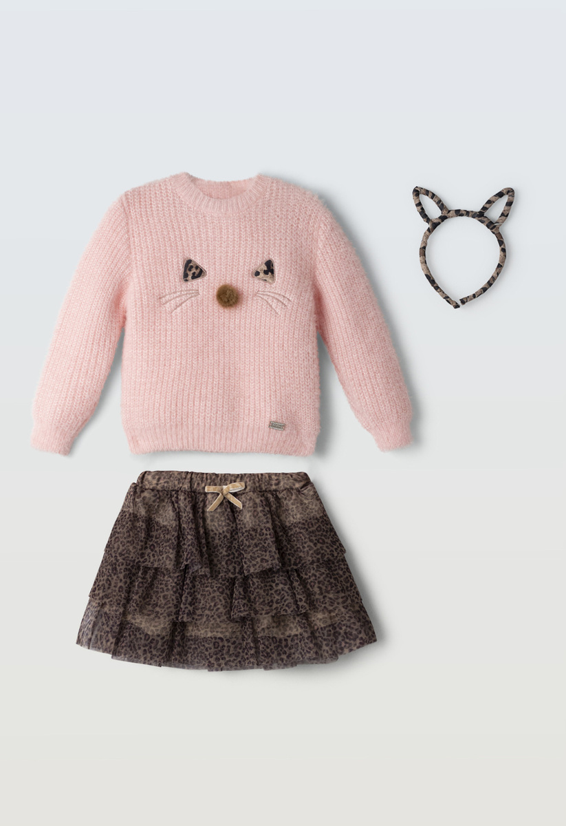 Σετ φούστα ΕΒΙΤΑ, μπλούζα πλεκτή με λαιμόκοψη σε ροζ χρώμα, φούστα με βολάν και λεοπάρ τύπωμα σε χρώμα καφέ και ασορτί στέκα.