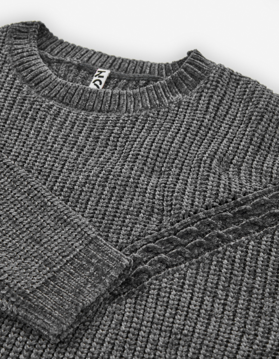 Πλεκτή μπλούζα LOSAN σε σκούρο γκρι χρώμα με στρογγυλή ριπ λαιμόκοψη και ριπ λάστιχο στα μανίκια και το τελείωμα.