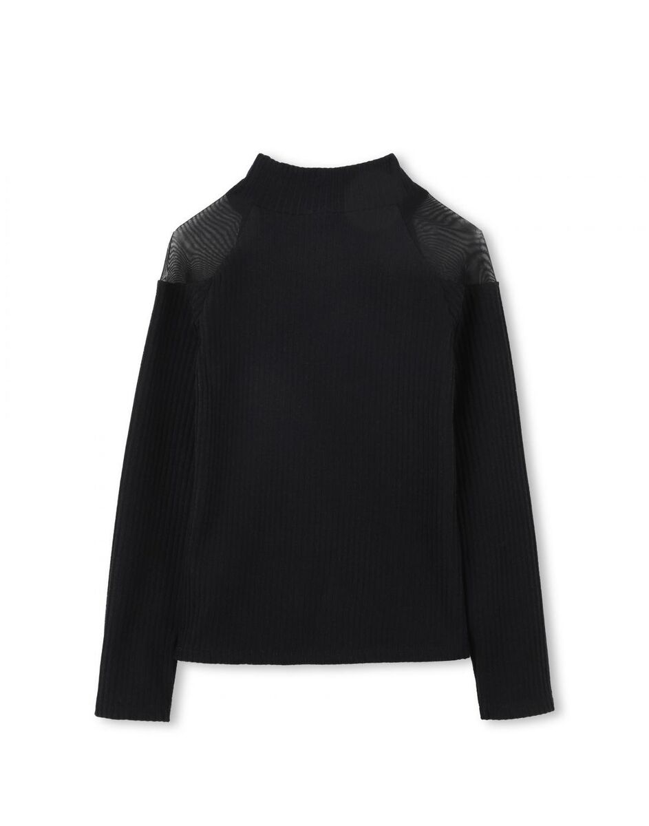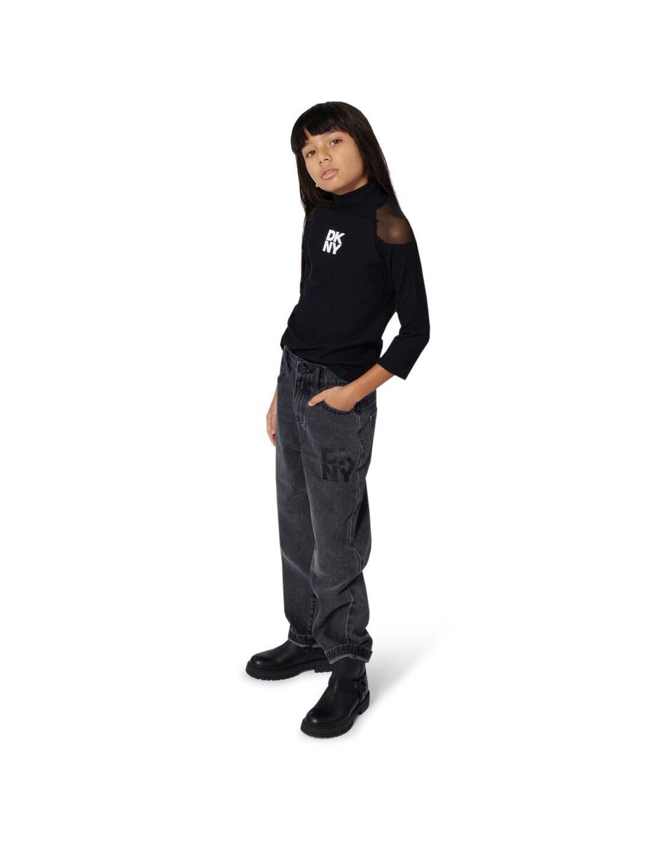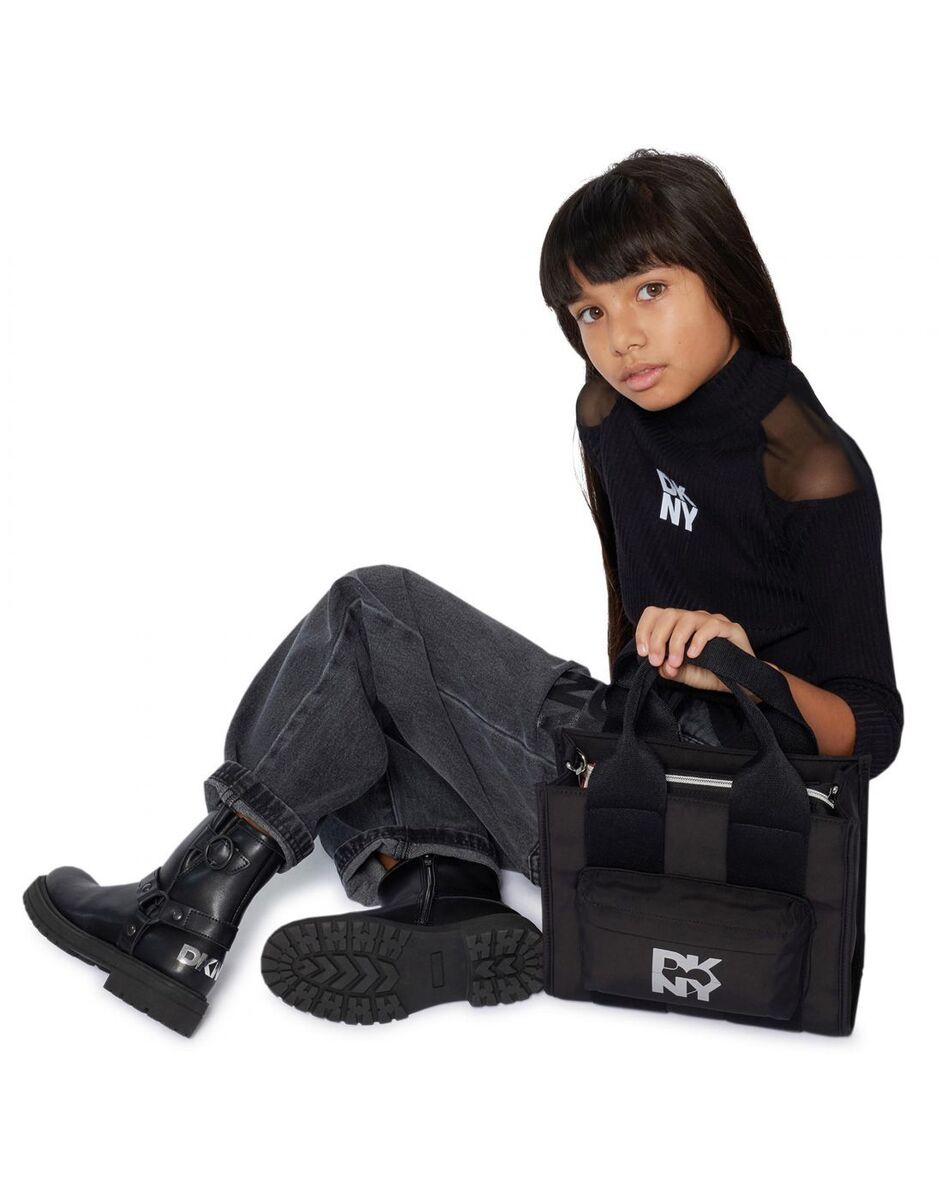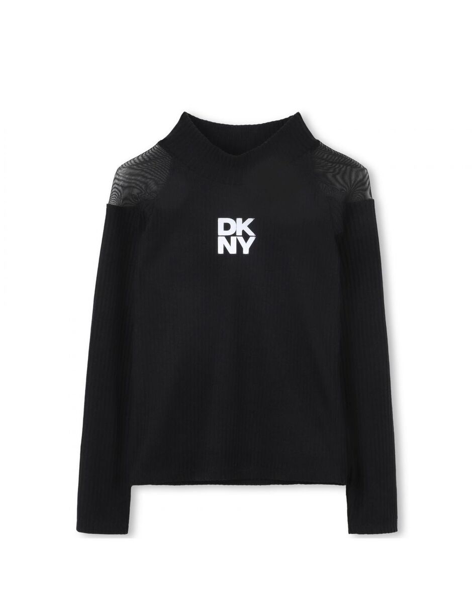 Μπλούζα ζιβάγκο D.K.N.Y. σε μαύρο χρώμα με logo print στο στήθος και διαφάνεια από τούλι στους ώμους.