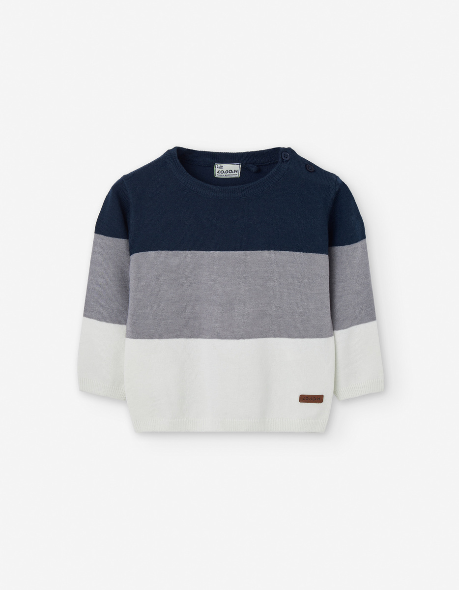 Πλεκτή μπλούζα LOSAN σε μπλε-γκρι χρώμα, στρογγυλή λαιμόκοψη και κούμπωμα στον ώμο.