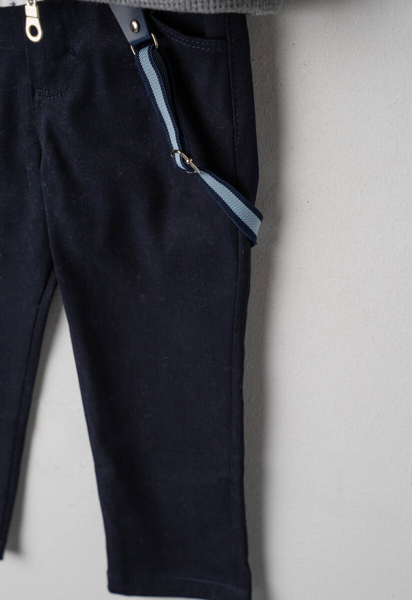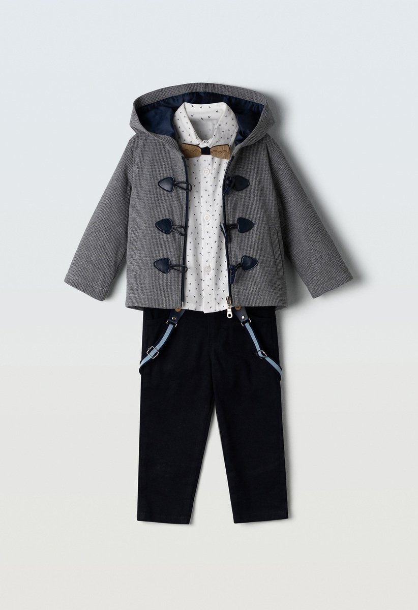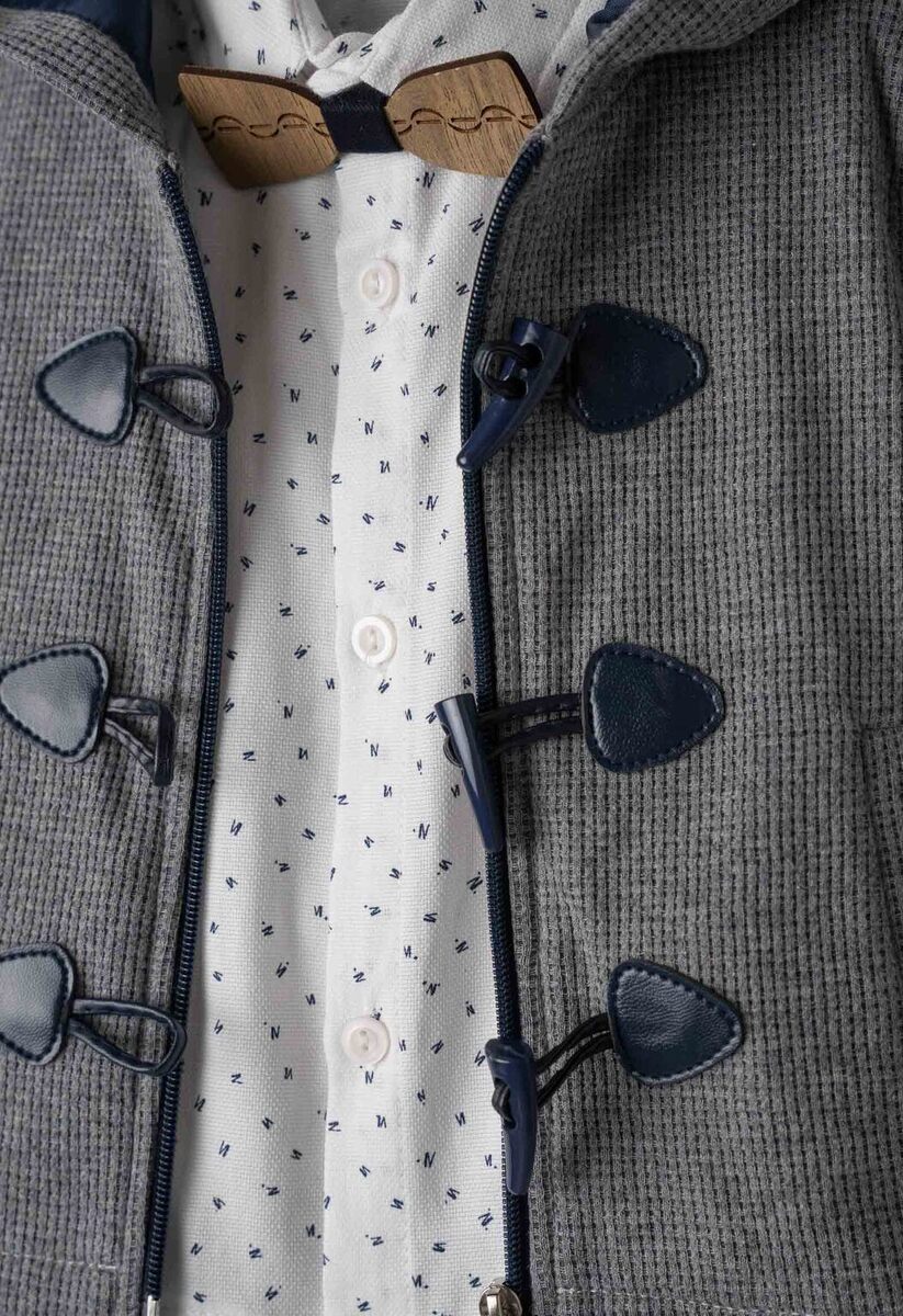 Σετ 3 τεμ. HASHTAG, παλτό σε γκρι χρώμα με κουκούλα, πουκάμισο με ανεξάρτητο παπιγιόν σε χρώμα λευκό και παντελόνι υφασμάτινο σε μπλε χρώμα με αποσπώμενες τιράντες και εσωτερικά ρυθμιζόμενο λάστιχο μέσης.