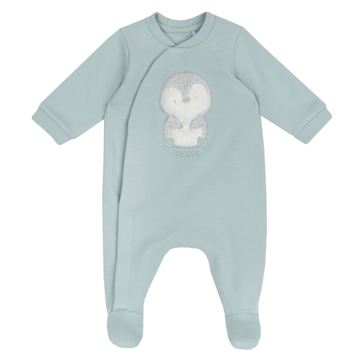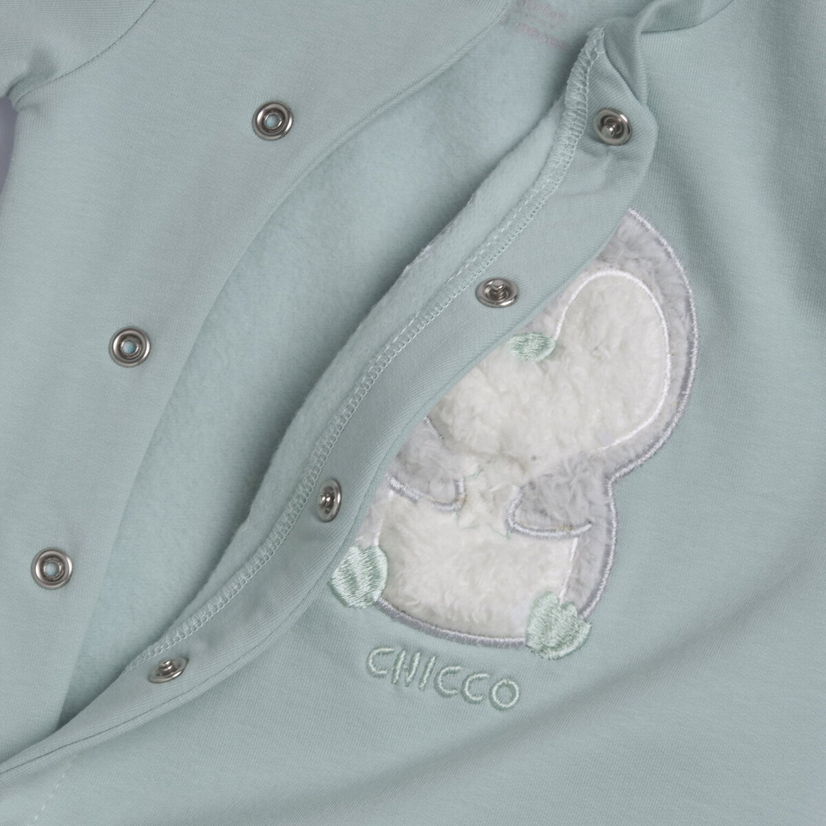 Φορμάκι φούτερ CHICCO σε μέντα χρώμα με ανάγλυφο τύπωμα κουκουβάγιας και κούμπωμα με τρουκς στο πλάι στο μπροστινό μέρος.