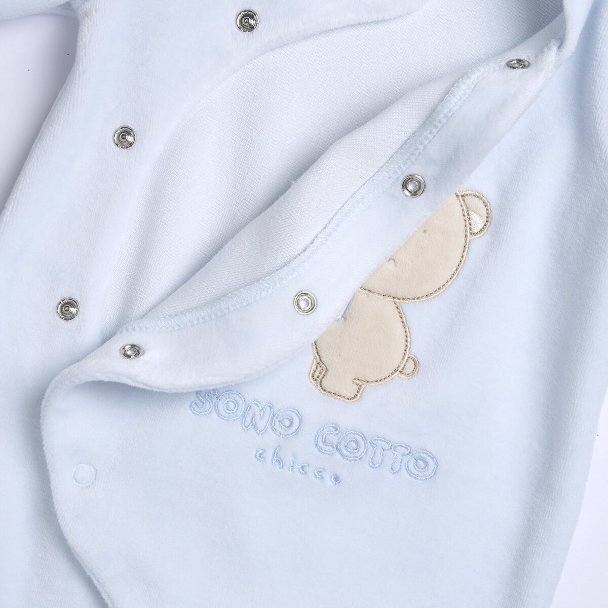 Βελουτέ φορμάκι CHICCO σε σιέλ χρώμα με ανάγλυφο τύπωμα και κούμπωμα με τρουκς στο πλάι στο μπροστινό μέρος.