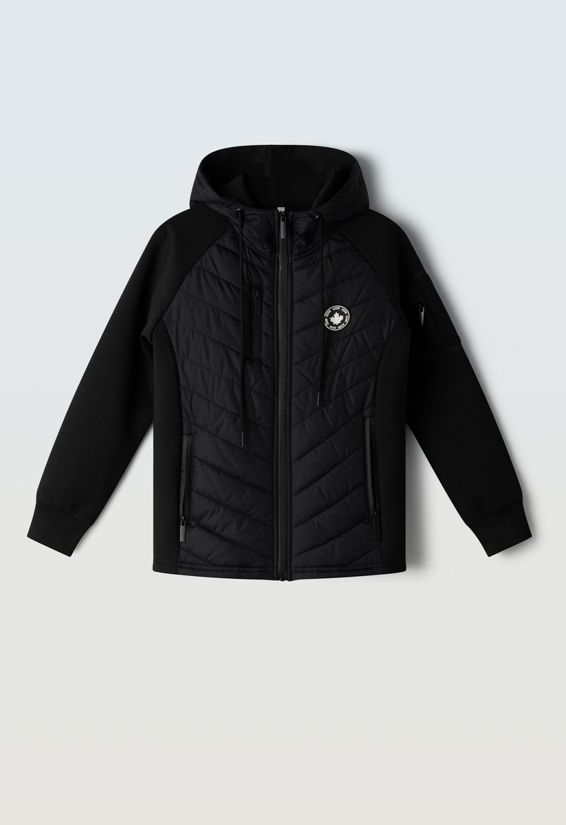 Ζακέτα HASHTAG σε μαύρο χρώμα με ενσωματωμένη ρυθμιζόμενη κουκούλα, ισοθερμικό ύφασμα, καπιτονέ σχέδιο στο μπροστινό μέρος, κούμπωμα με φερμουάρ και δύο εσωτερικές τσέπες στο πλάι.