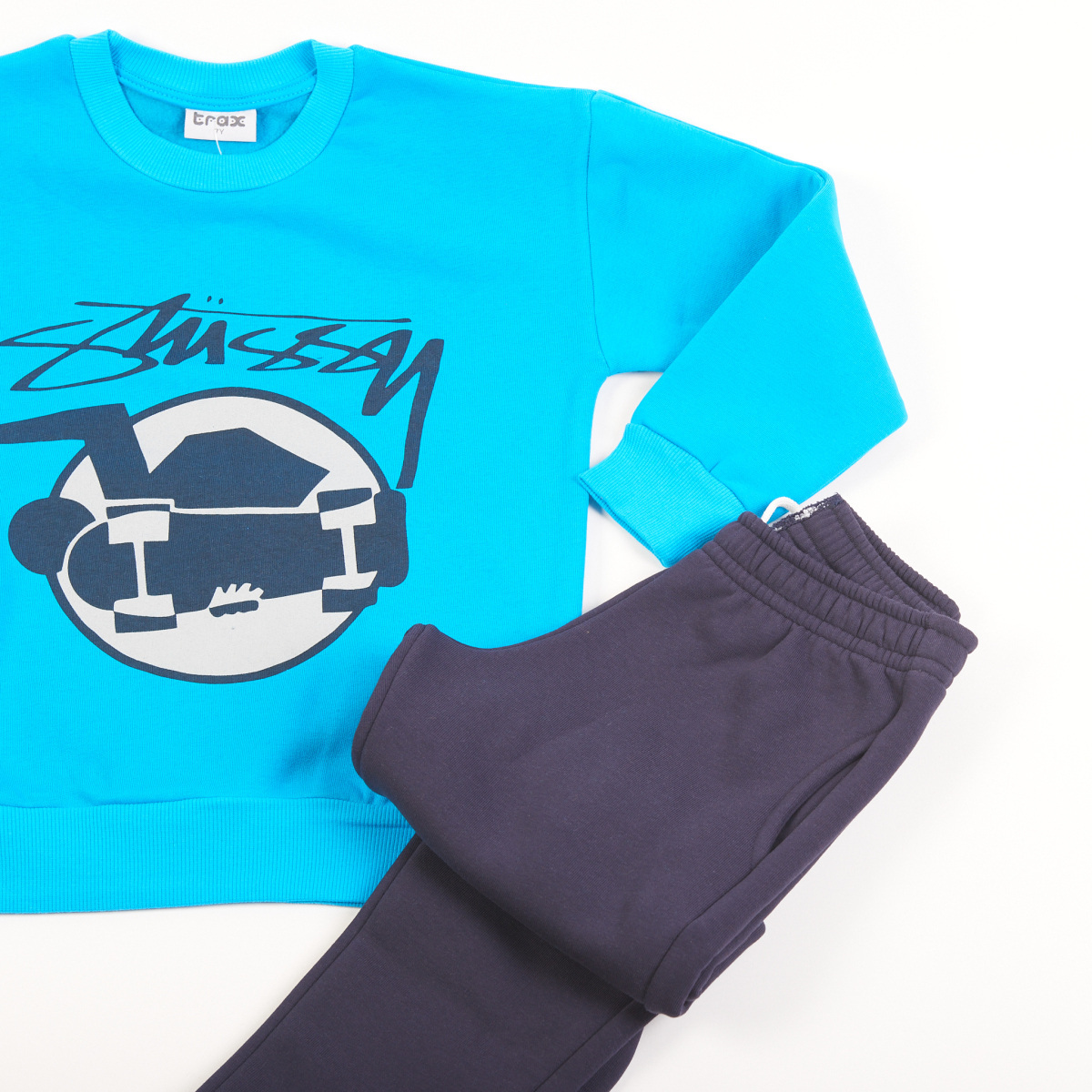 Σετ φόρμας TRAX, μπλούζα φούτερ με στρογγυλή λαιμόκοψη σε τιρκουάζ χρώμα και παντελόνι φούτερ με λάστιχο στη μέση σε χρώμα μπλε.