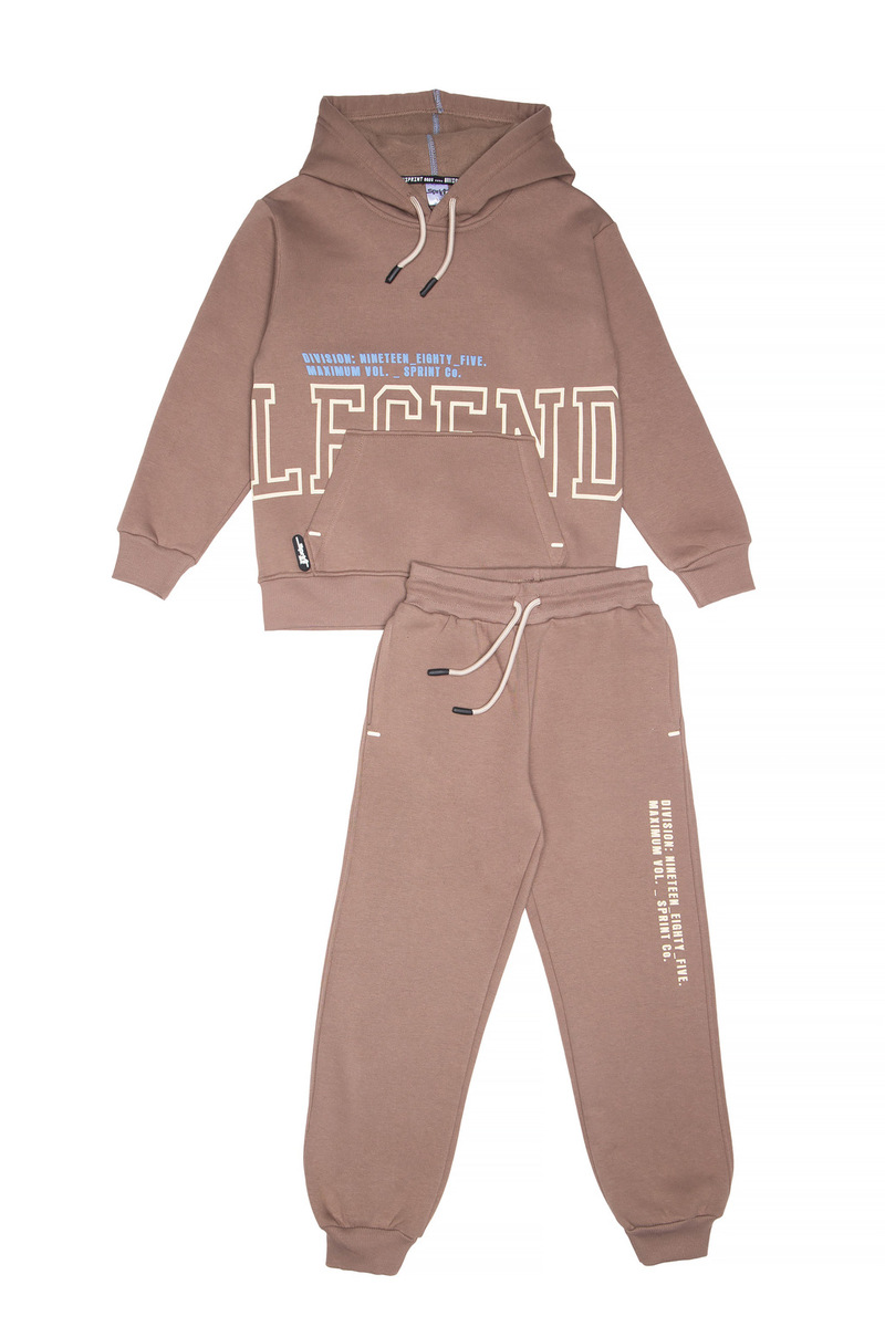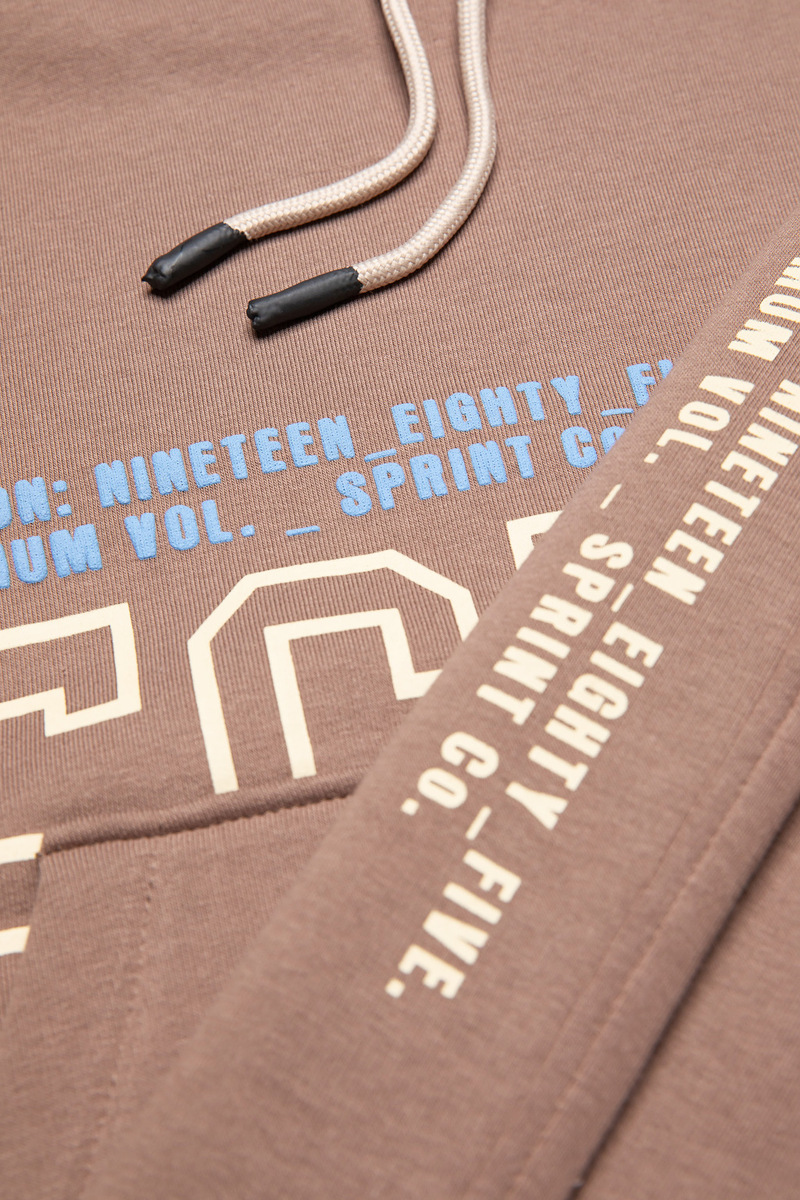 Σετ φόρμας SPRINT, μπλούζα φούτερ με κουκούλα σε σκούρο μπεζ χρώμα και παντελόνι φούτερ με λάστιχο και ανεξάρτητο εσωτερικό κορδόνι στη μέση.