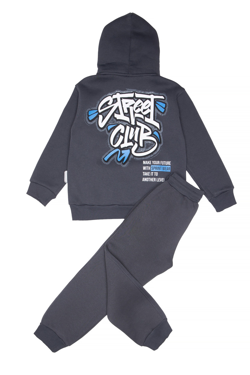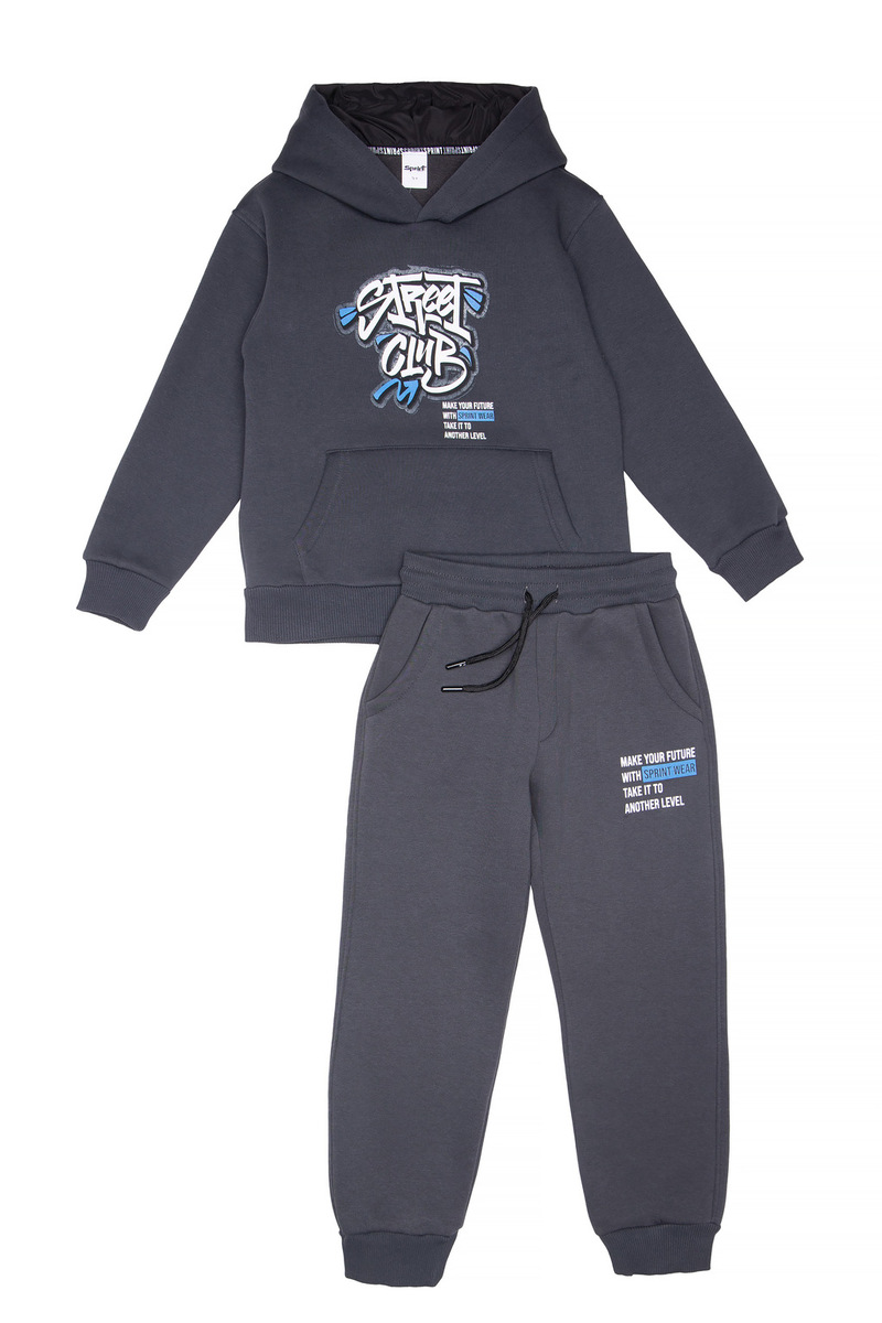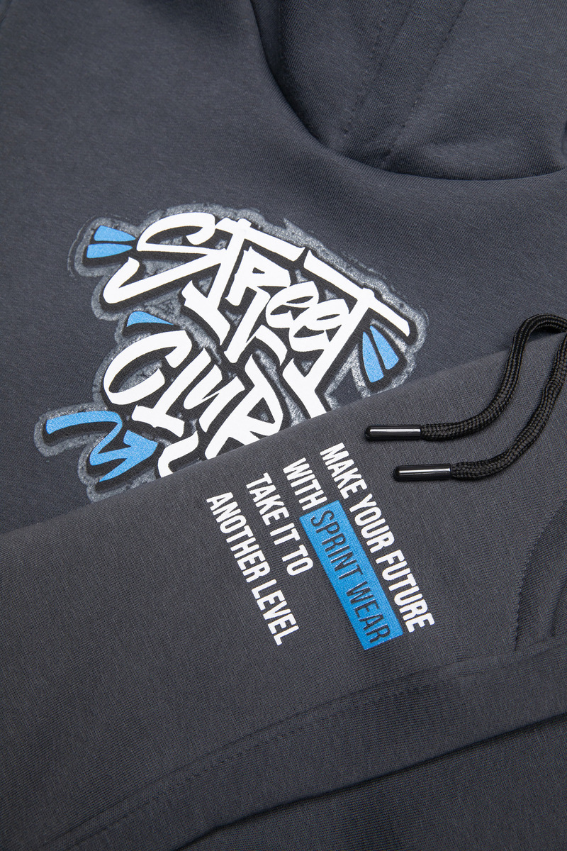 Σετ φόρμας SPRINT, μπλούζα φούτερ με ενσωματωμένη κουκούλα αδιάβροχη στο εσωτερικό και παντελόνι φούτερ με λάστιχο και ανεξάρτητο εσωτερικό κορδόνι στη μέση σε σκούρο γκρι χρώμα.