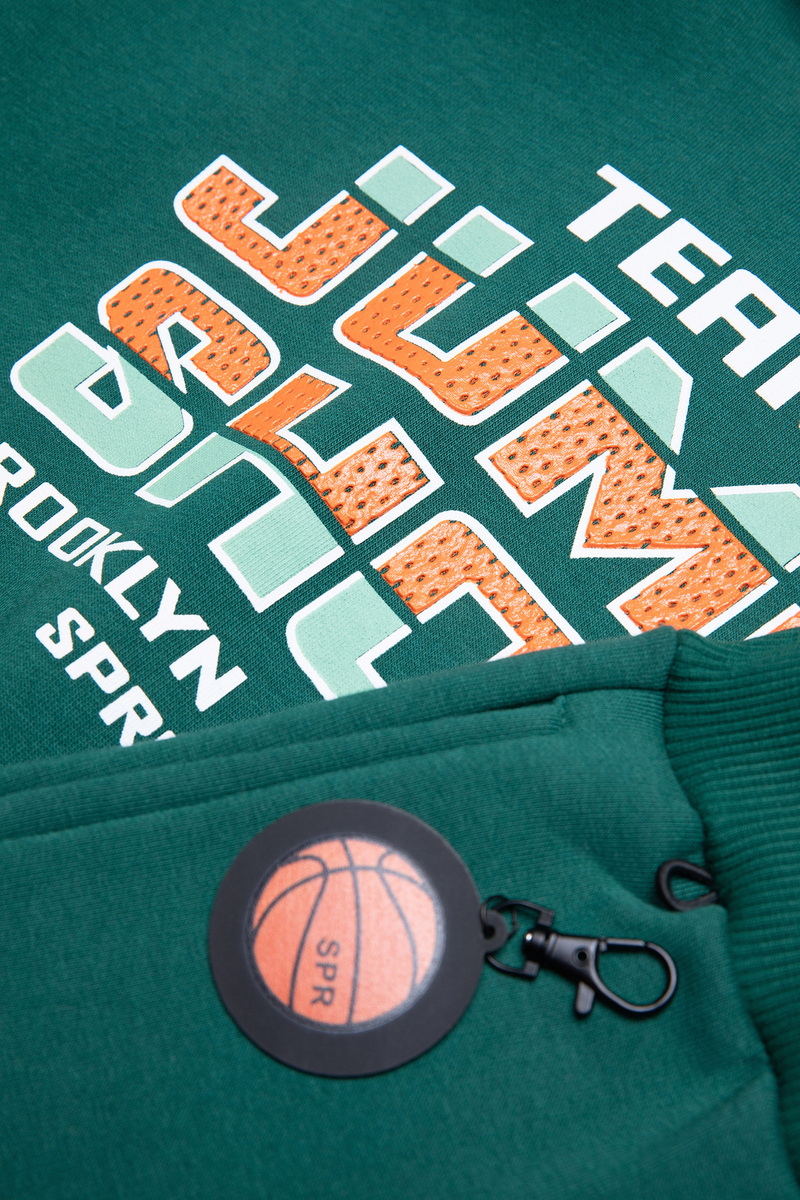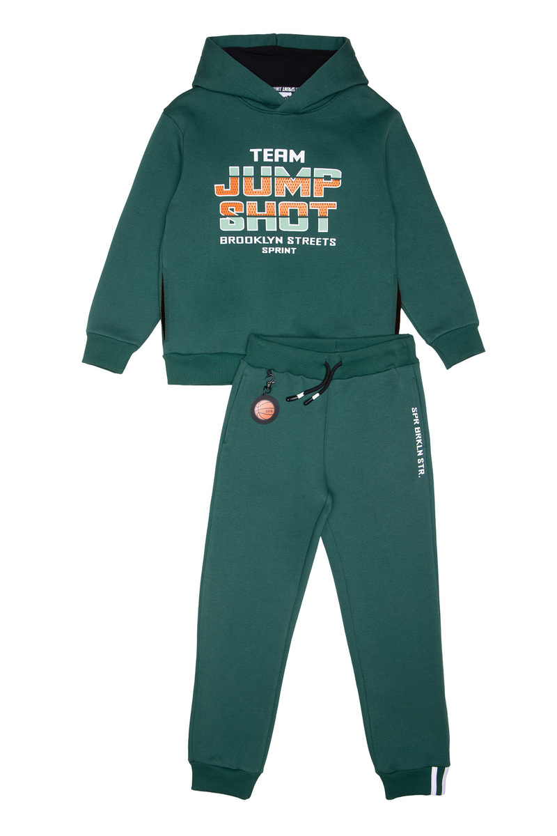 Σετ φόρμας SPRINT σε σκούρο πράσινο χρώμα, μπλούζα φούτερ με ενσωματωμένη κουκούλα και παντελόνι φούτερ με αποσπώμενο μπρελόκ, λάστιχο και ανεξάρτητο εσωτερικό κορδόνι στη μέση.