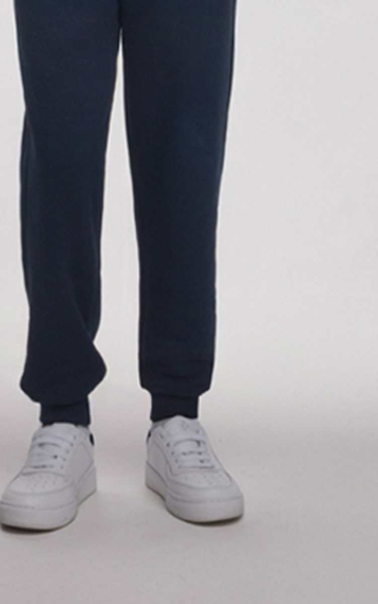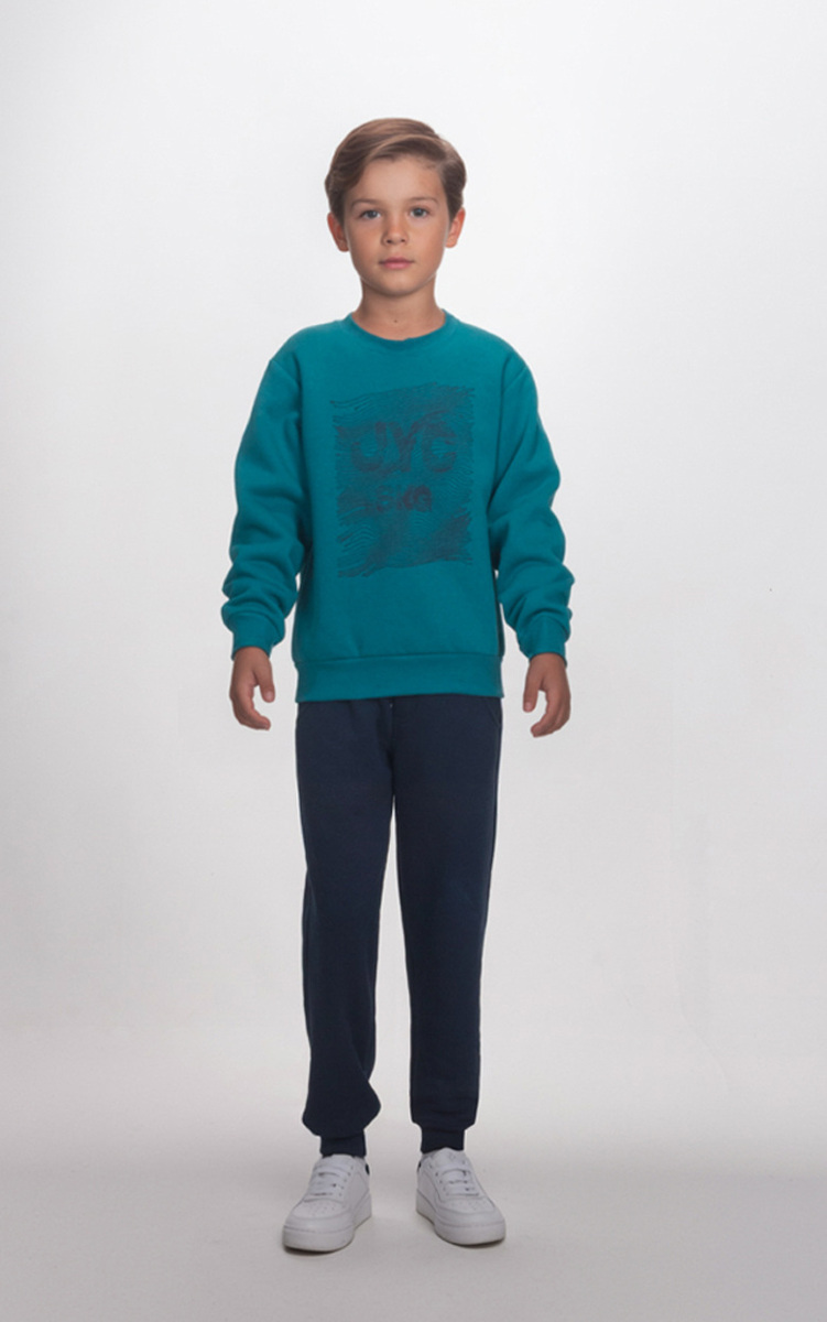 Σετ φόρμας JOYCE, μπλούζα φούτερ σε πετρόλ χρώμα με στρογγυλή λαιμόκοψη, ριπ λάστιχο στα μανίκια και το τελείωμα και παντελόνι φούτερ σε χρώμα μπλε σκούρο με λάστιχο στη μέση και το τελείωμα.