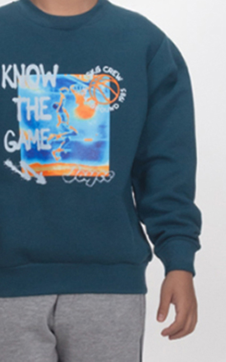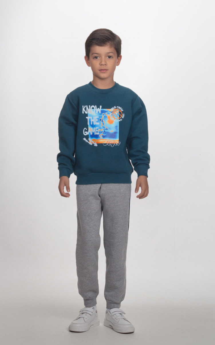 Σετ φόρμας JOYCE, μπλούζα φούτερ σε σκούρο πράσινο χρώμα με στρογγυλή λαιμόκοψη, ριπ λάστιχο στα μανίκια και το τελείωμα και παντελόνι φούτερ σε χρώμα γκρι με λάστιχο στη μέση και το τελείωμα.