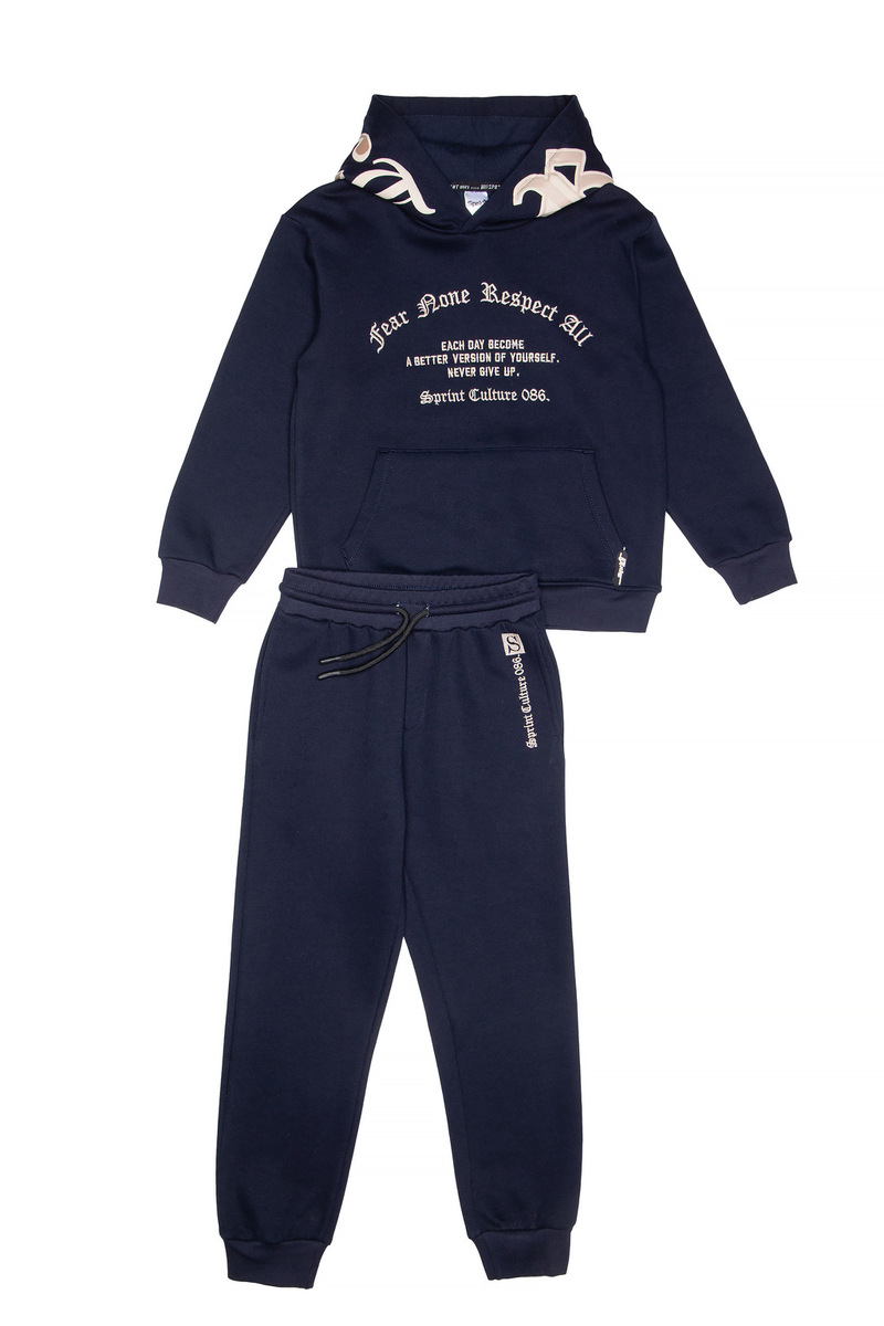 Σετ φόρμας SPRINT, μπλούζα φούτερ με ενσωματωμένη κουκούλα και παντελόνι φούτερ με λάστιχο και ανεξάρτητο εσωτερικό κορδόνι στη μέση σε μπλε σκούρο χρώμα.