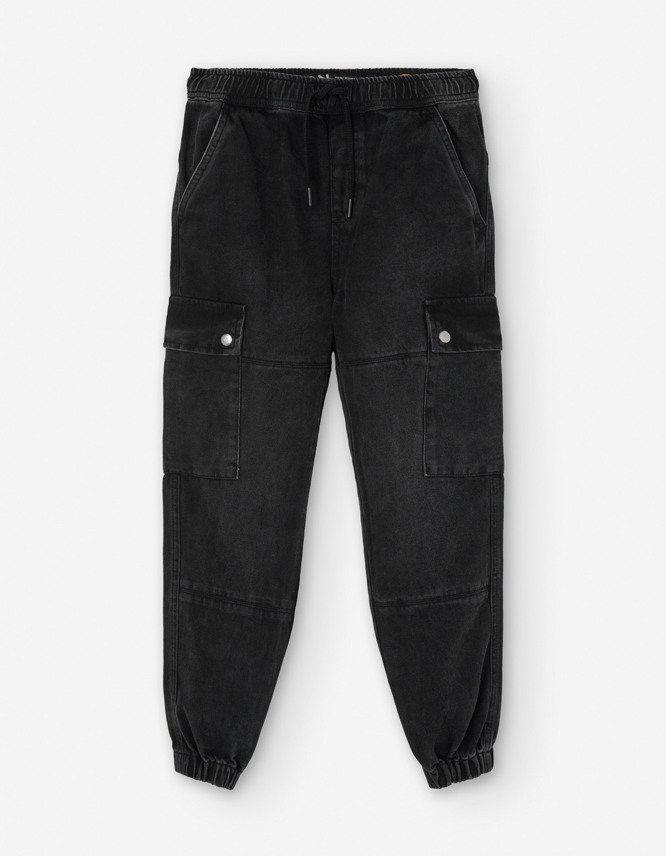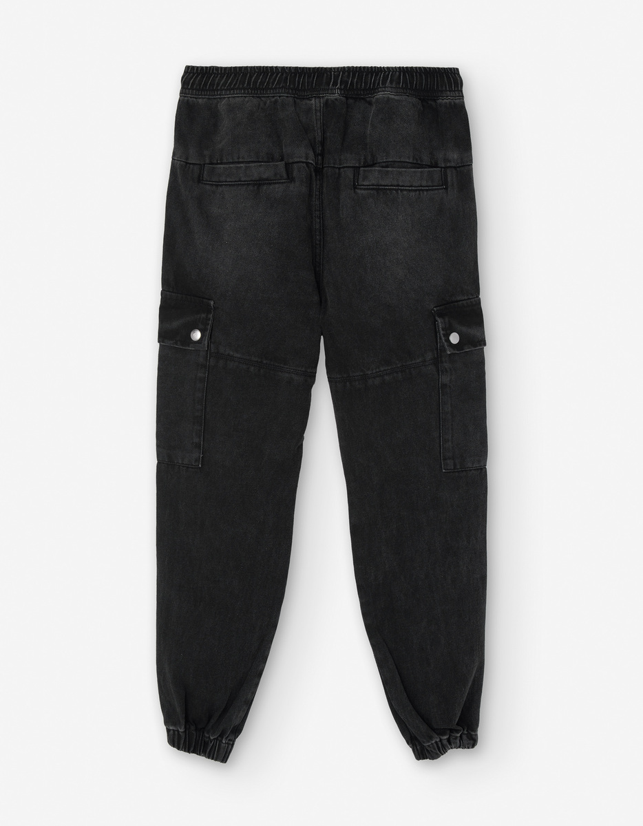 Παντελόνι τζιν cargo LOSAN σε μαύρο χρώμα με ρυθμιζόμενο εσωτερικό λάστιχο στη μέση, εξωτερικές τσέπες με κουμπιά και ελαστικό στο τελείωμα.