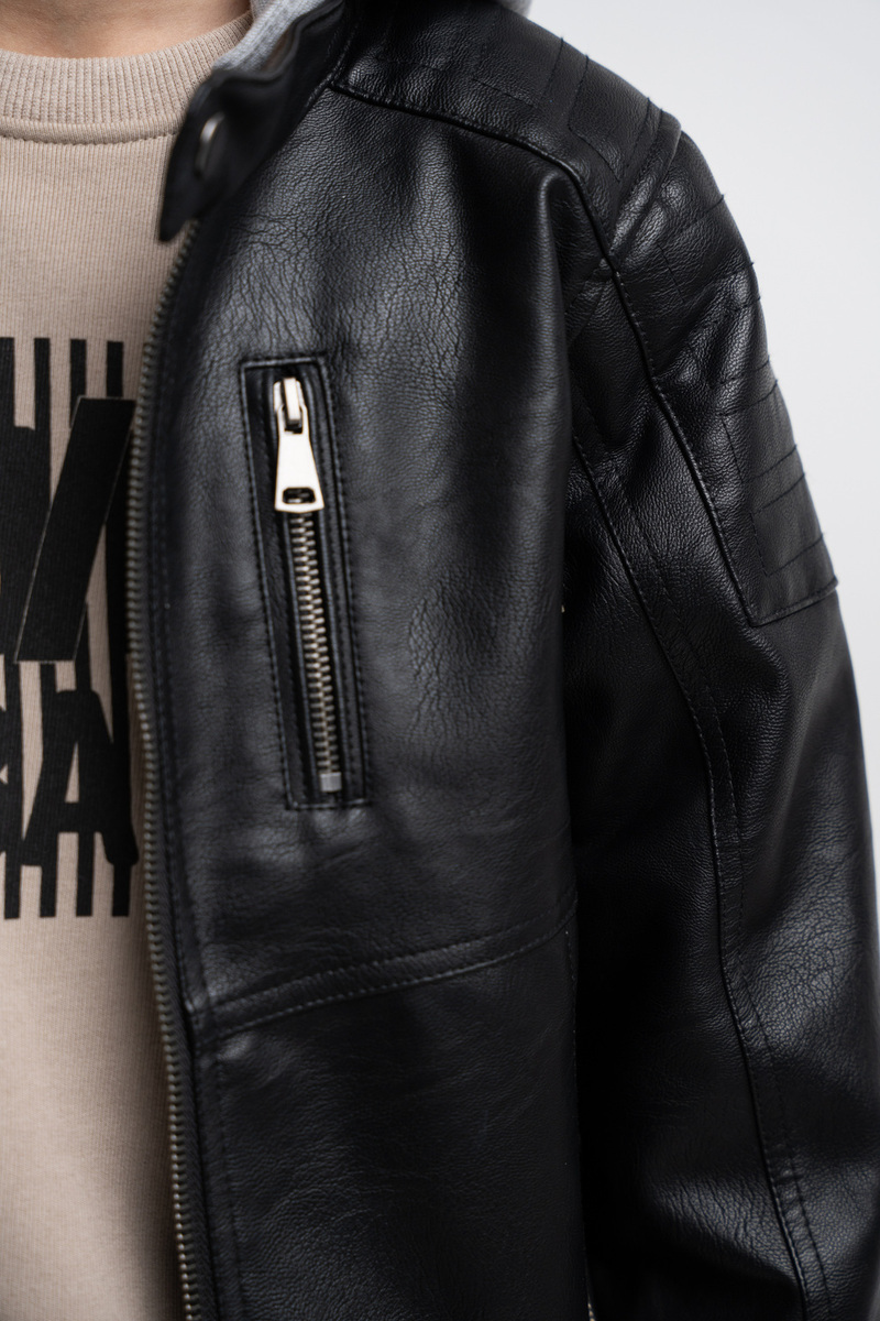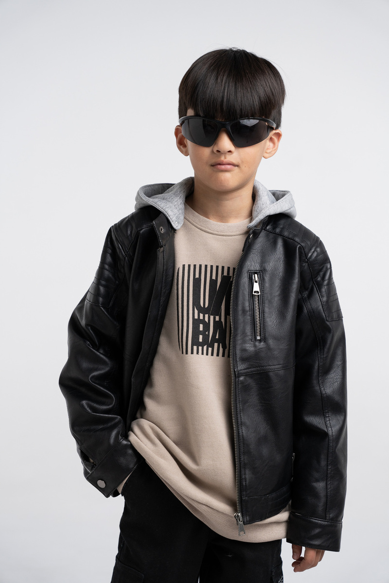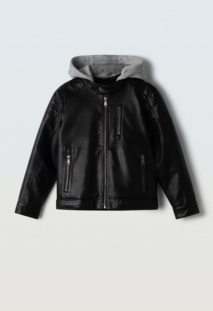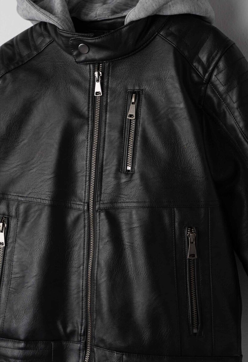 Δερμάτινο μπουφάν HASHTAG σε μαύρο χρώμα με αποσπώμενη κουκούλα φούτερ, κούμπωμα με κουμπί στη λαιμόκοψη και φερμουάρ, εσωτερική καπιτονέ φόδρα και δύο εσωτερικές τσέπες με φερμουάρ στο πλάι.