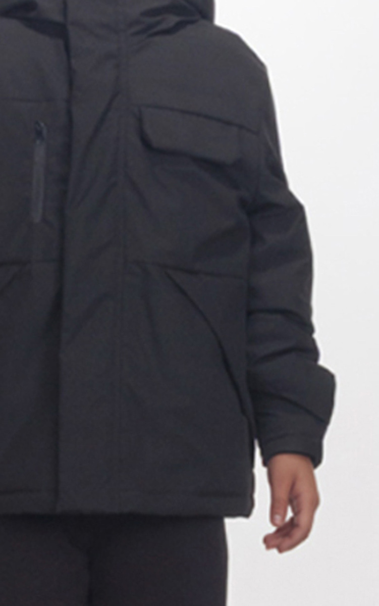 Μπουφάν JOYCE σε μαύρο χρώμα με ενσωματωμένη κουκούλα, διπλό κούμπωμα με φερμουάρ και κουμπιά, εσωτερική φόδρα, εξωτερικές και εσωτερικές τσέπες στο μπροστινό μέρος.