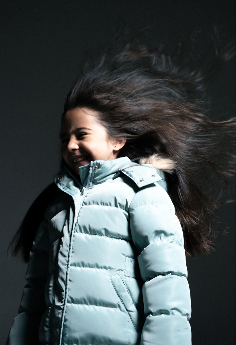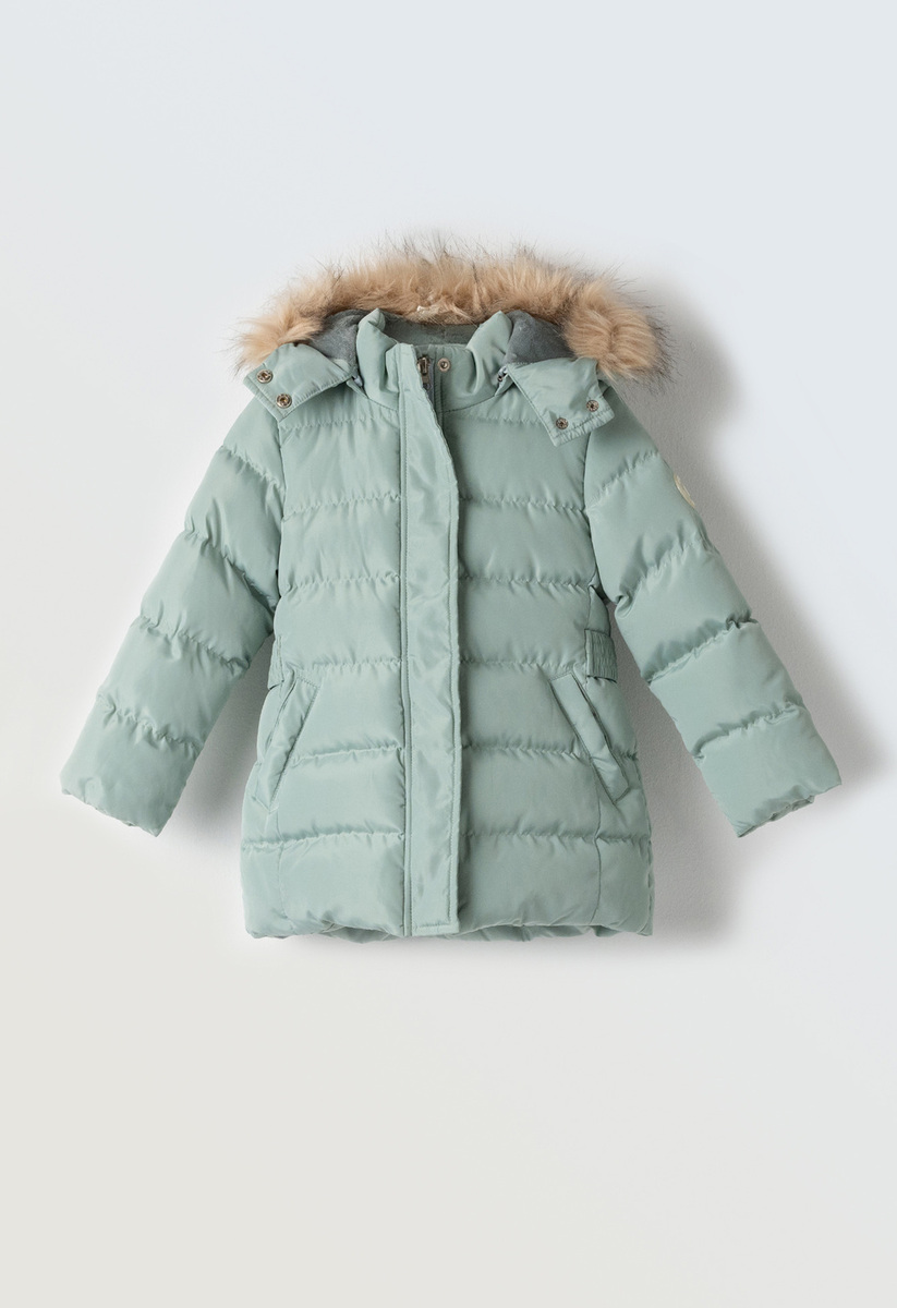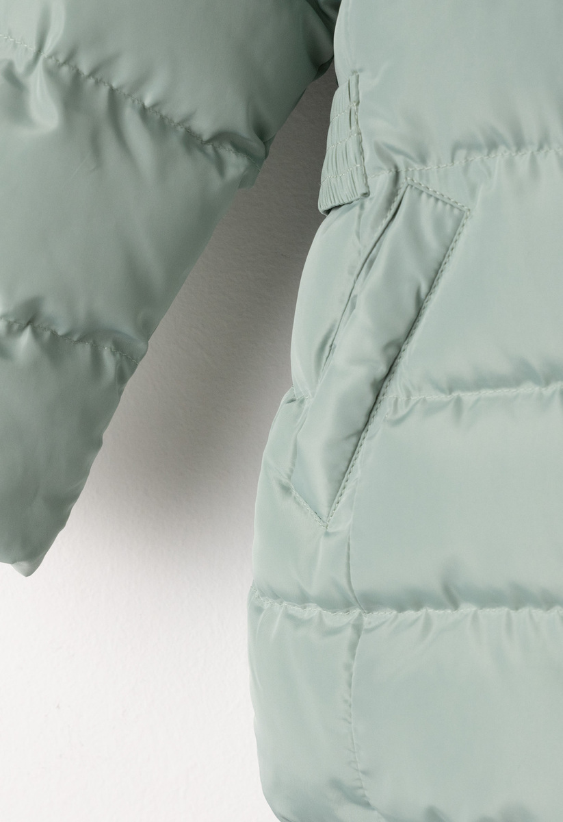 Μπουφάν ΕΒΙΤΑ σε μέντα χρώμα με αποσπώμενη κουκούλα, εσωτερική βελουτέ επένδυση, ελαστικότητα στη μέση, κούμπωμα με κουμπιά και φερμουάρ, δύο εσωτερικές τσέπες.