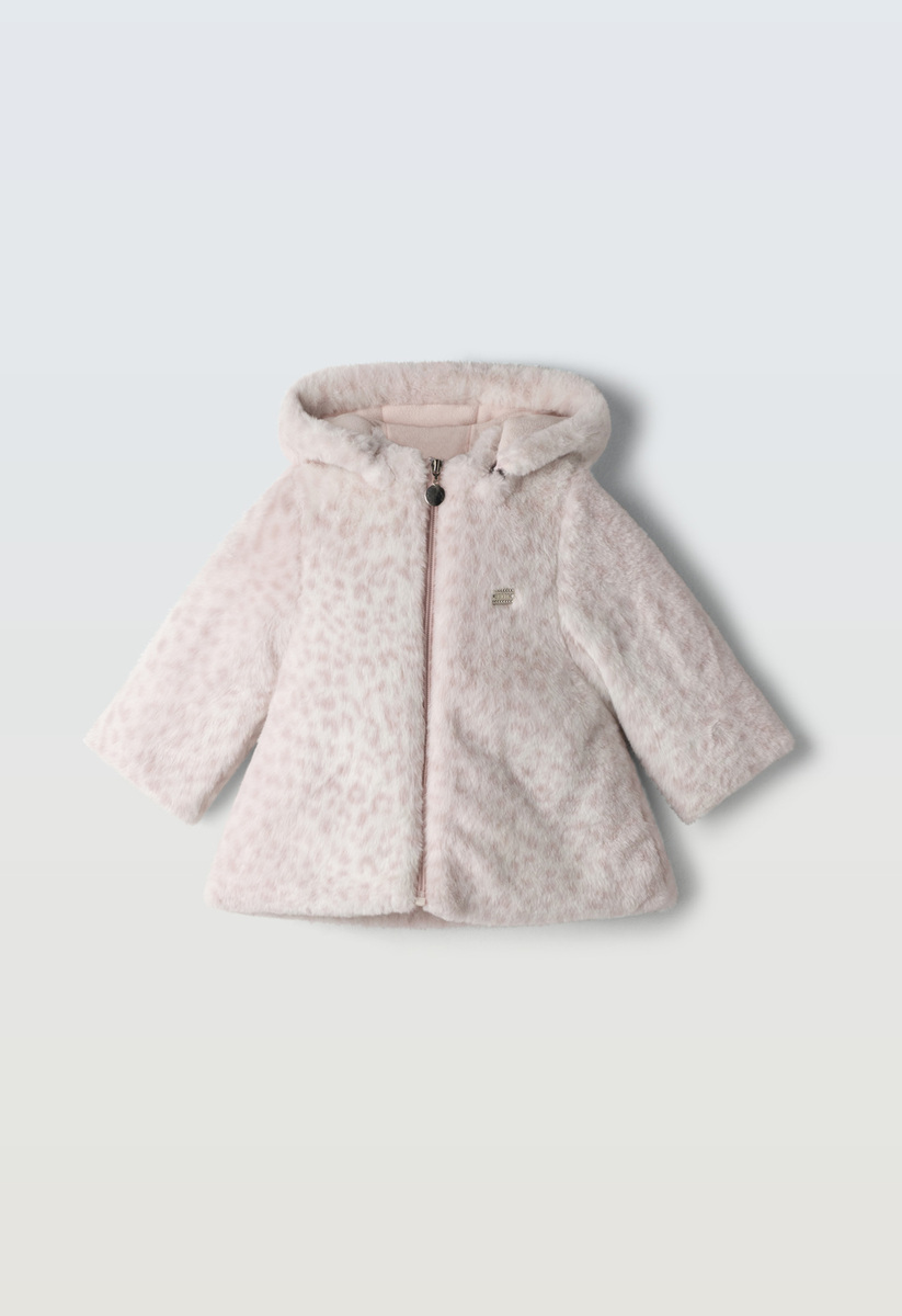 Γούνα ΕΒΙΤΑ με λεοπάρ τύπωμα, αφαιρούμενη κουκούλα, σε εκρού-ροζ χρώμα.