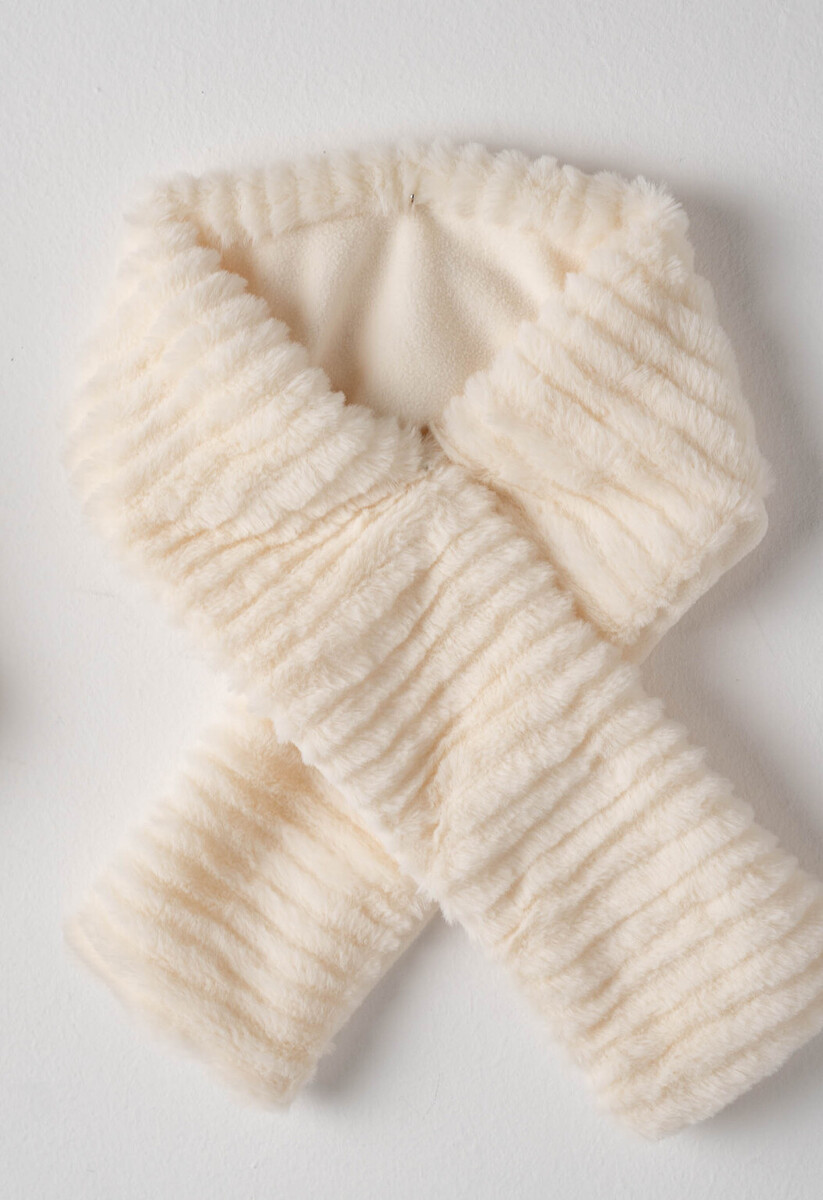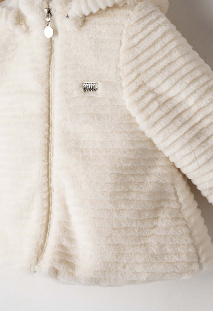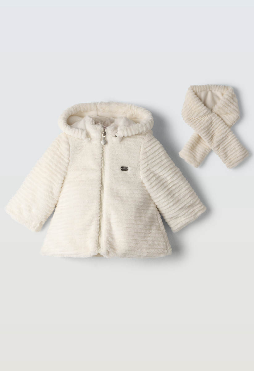 Γούνα ΕΒΙΤΑ με κουκούλα και ασορτί κασκόλ, σε εκρού χρώμα.