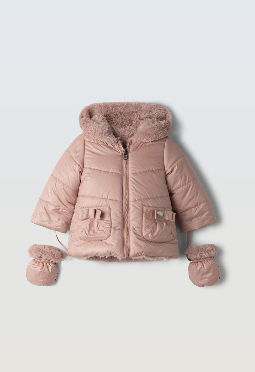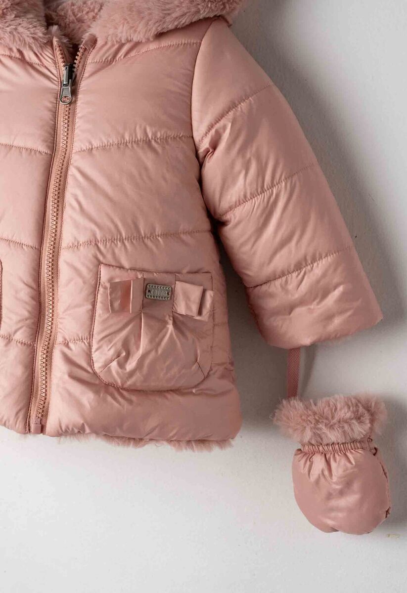 Μπουφάν-γούνα (2 όψεις) ΕΒΙΤΑ, με ασορτί γάντια, σε ροζ χρώμα.