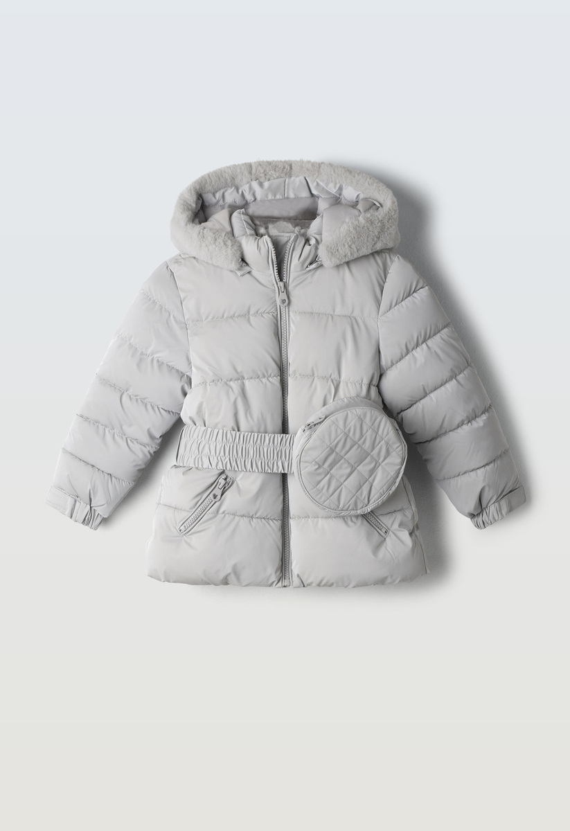 Μπουφάν ΕΒΙΤΑ σε γκρι χρώμα με αποσπώμενη κουκούλα, fleece επένδυση στο εσωτερικό, δύο εσωτερικές τσέπες με φερμουάρ στο πλάι, κούμπωμα με φερμουάρ και ανεξάρτητη ζώνη-τσαντάκι στη μέση.