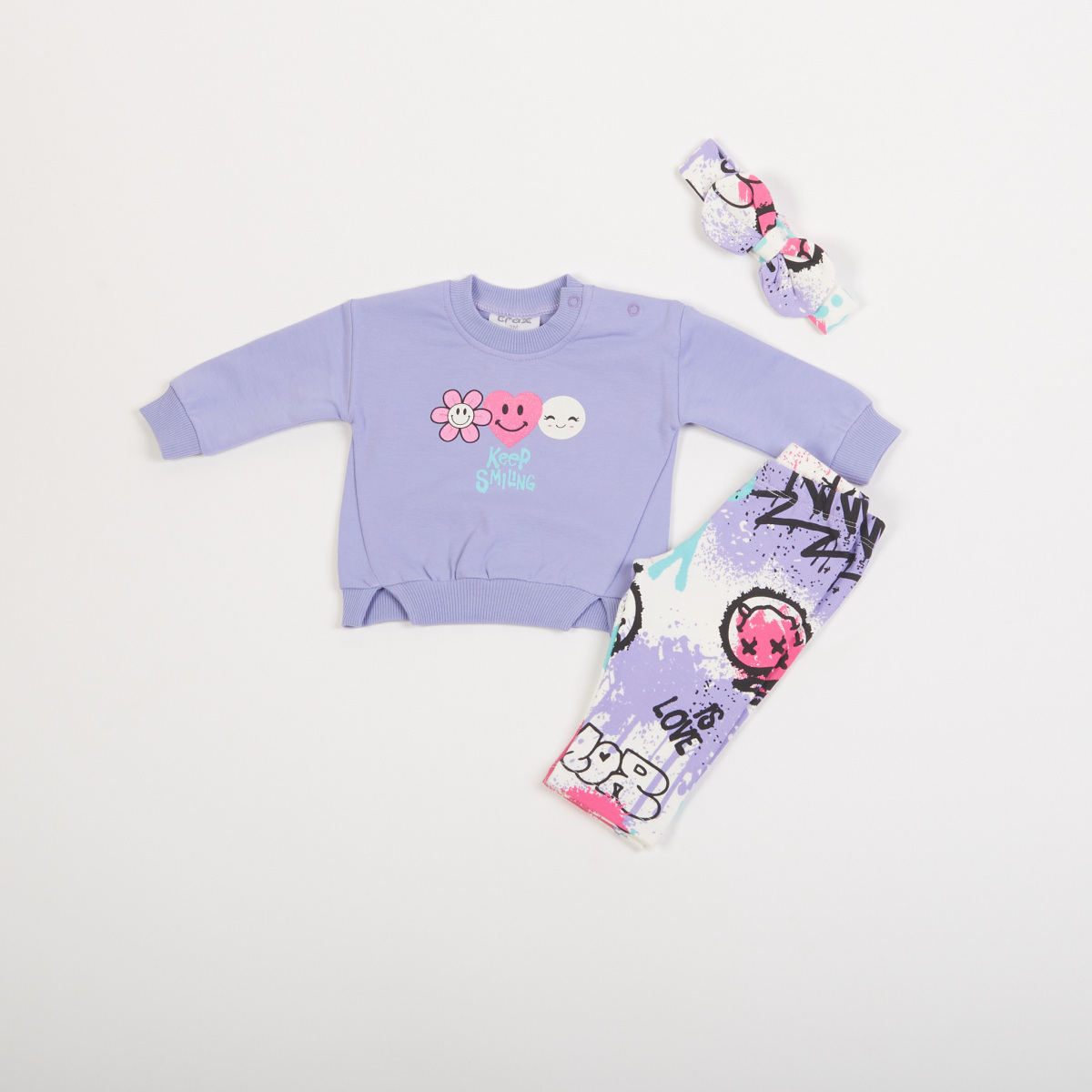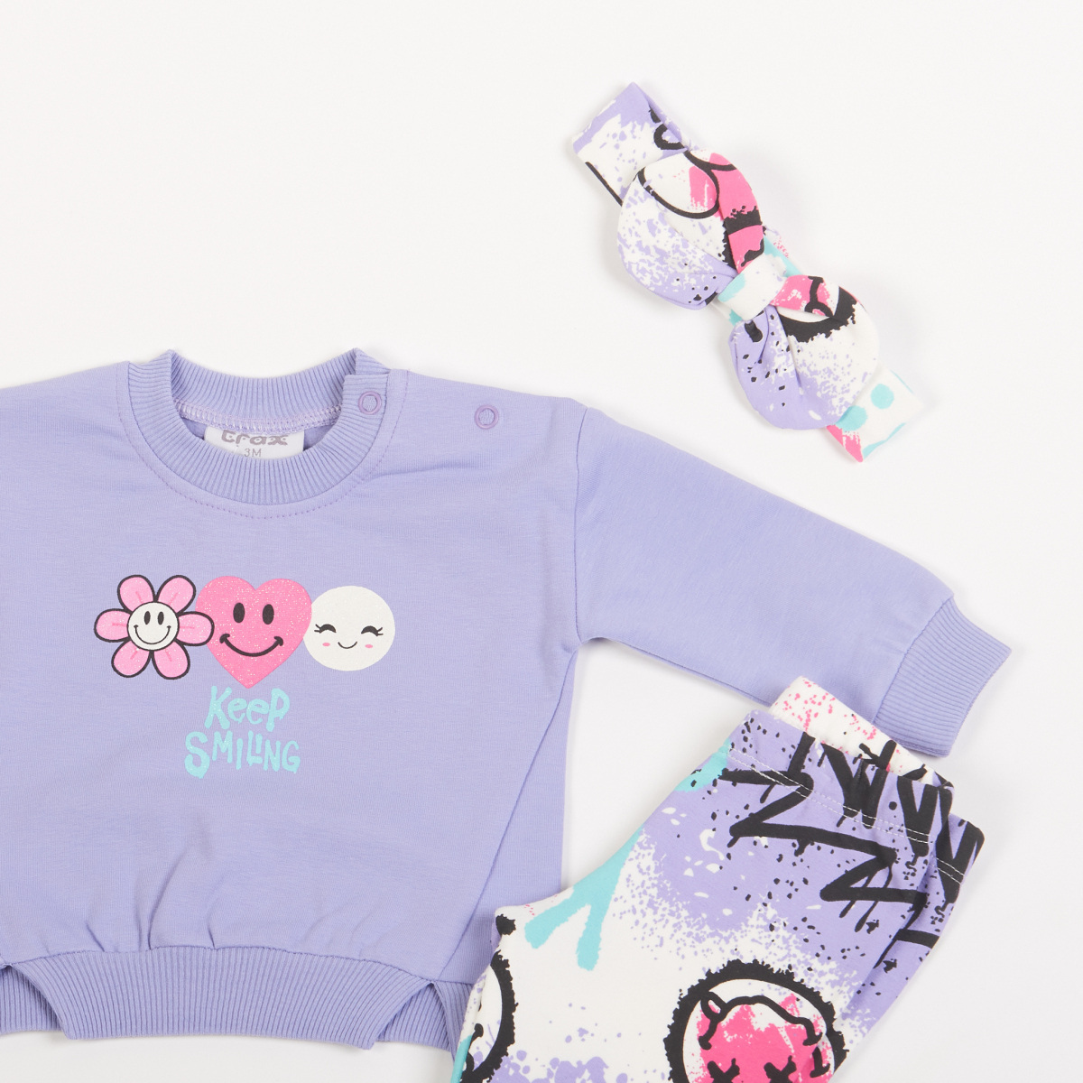 Σετ κολάν TRAX, μπλούζα φούτερ σε λιλά χρώμα και κολάν με all over τύπωμα και λάστιχο στη μέση.