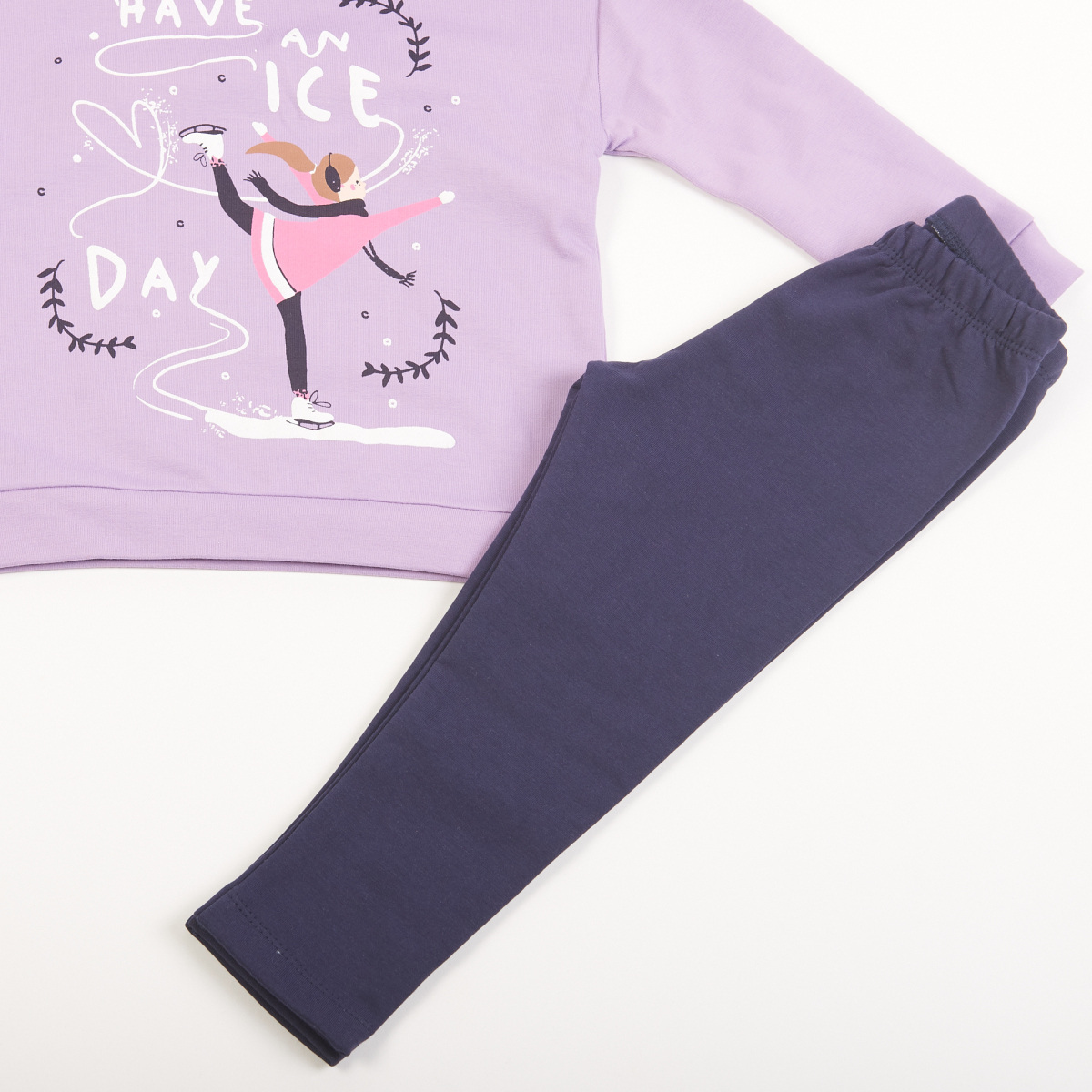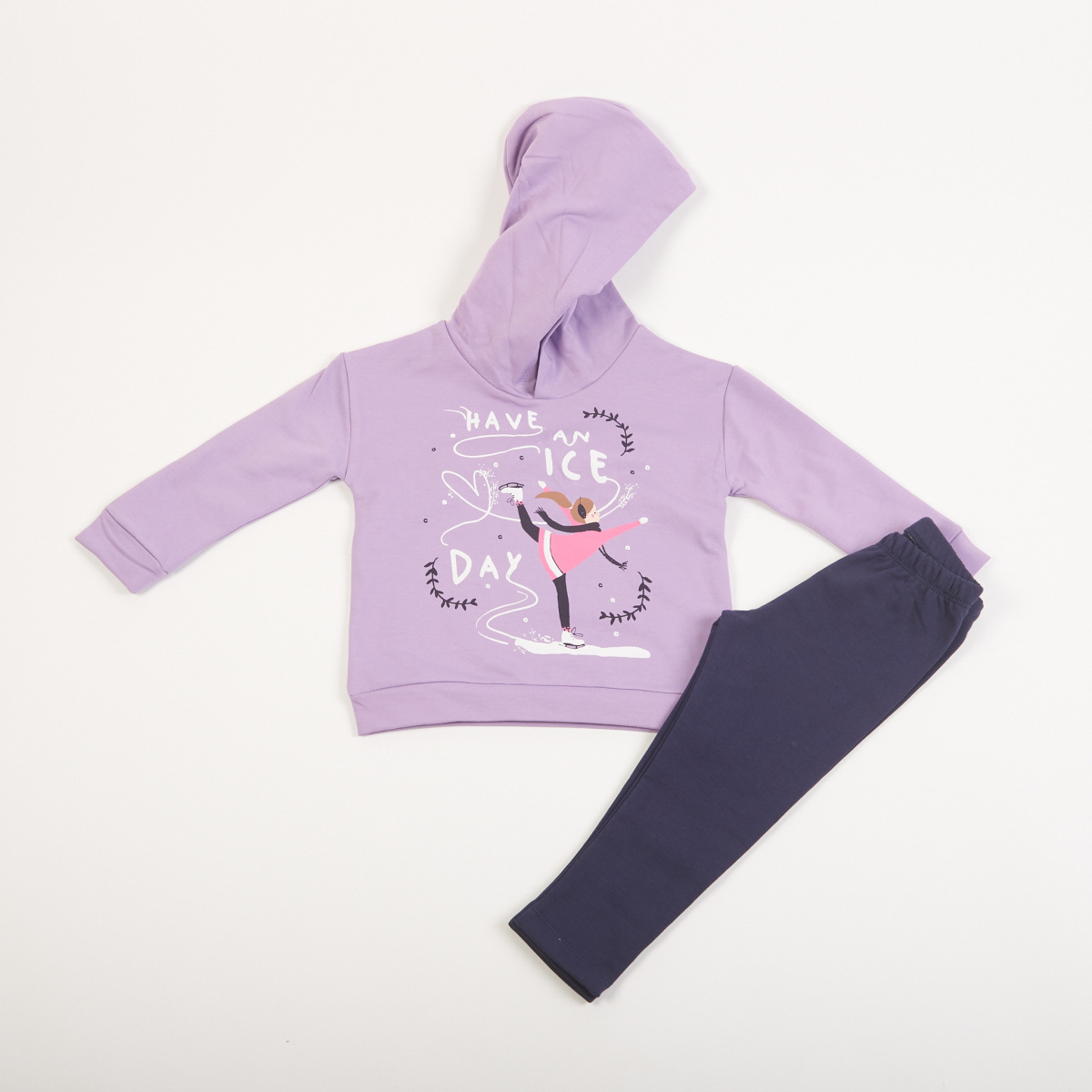 Σετ κολάν TRAX, μπλούζα φούτερ με κουκούλα σε λιλά χρώμα και κολάν με λάστιχο στη μέση σε χρώμα μπλε.