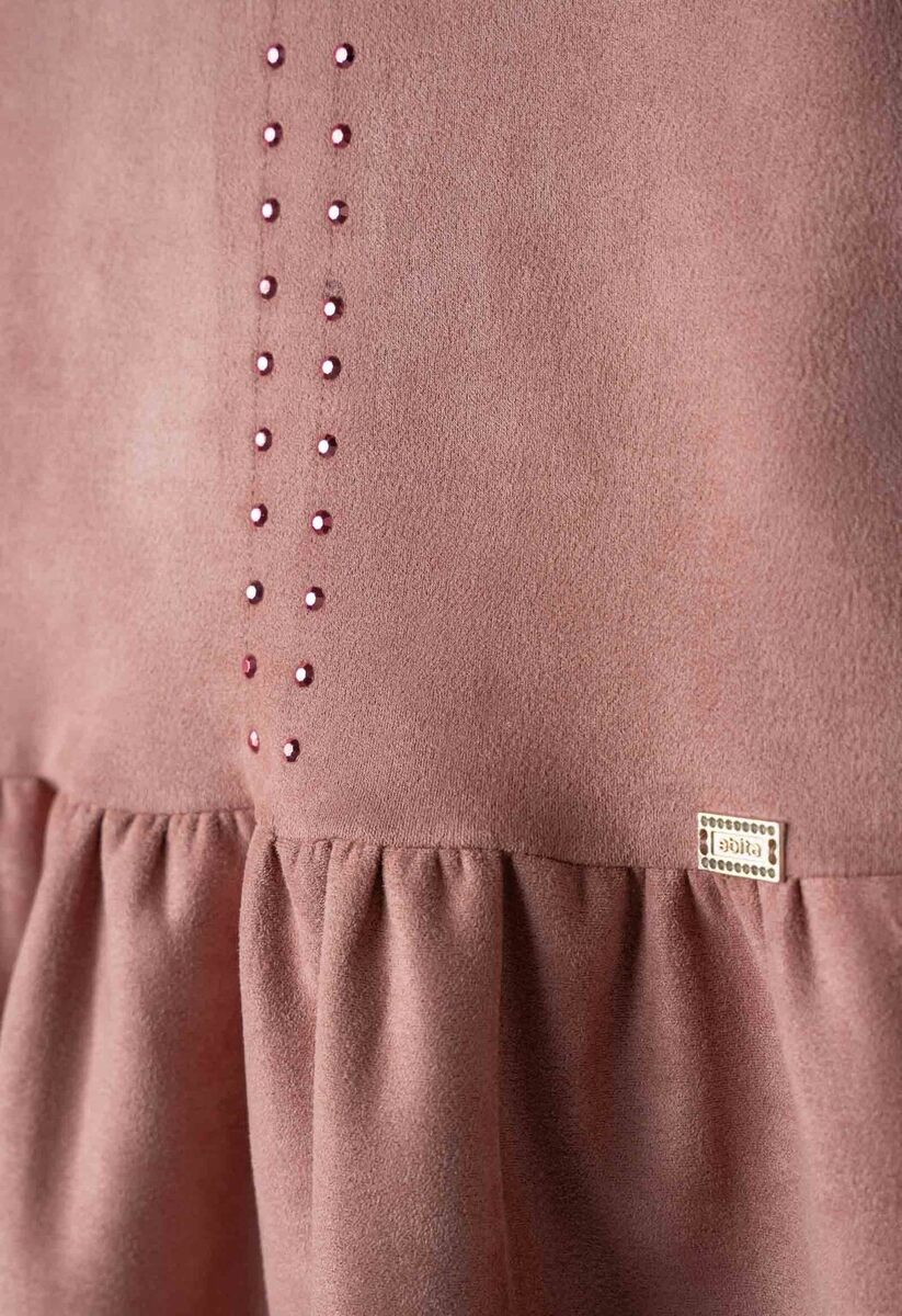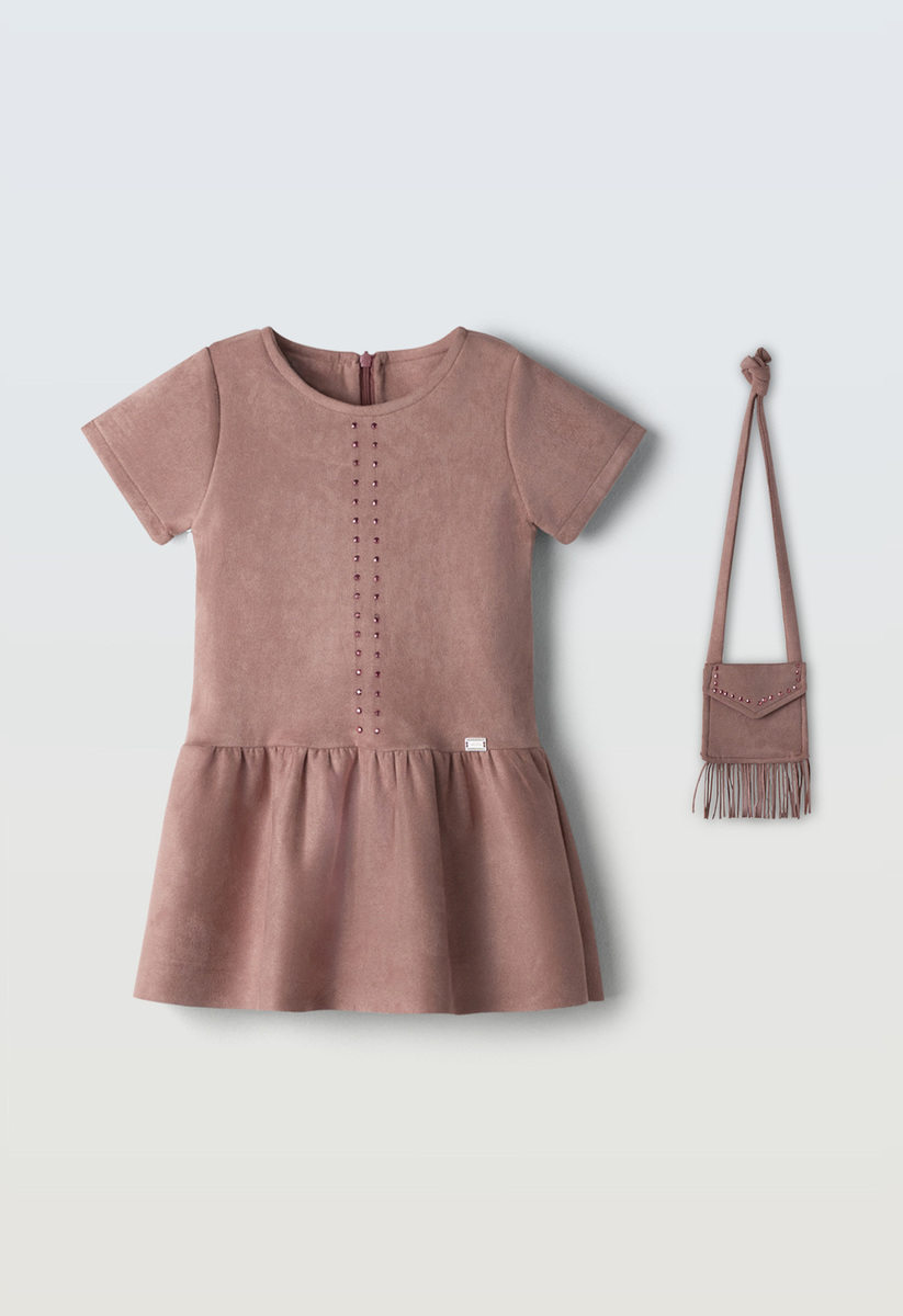 Φόρεμα δερμάτινο ΕΒΙΤΑ με κούμπωμα στο πίσω μέρος και ασορτί τσαντάκι σε ροζ χρώμα.