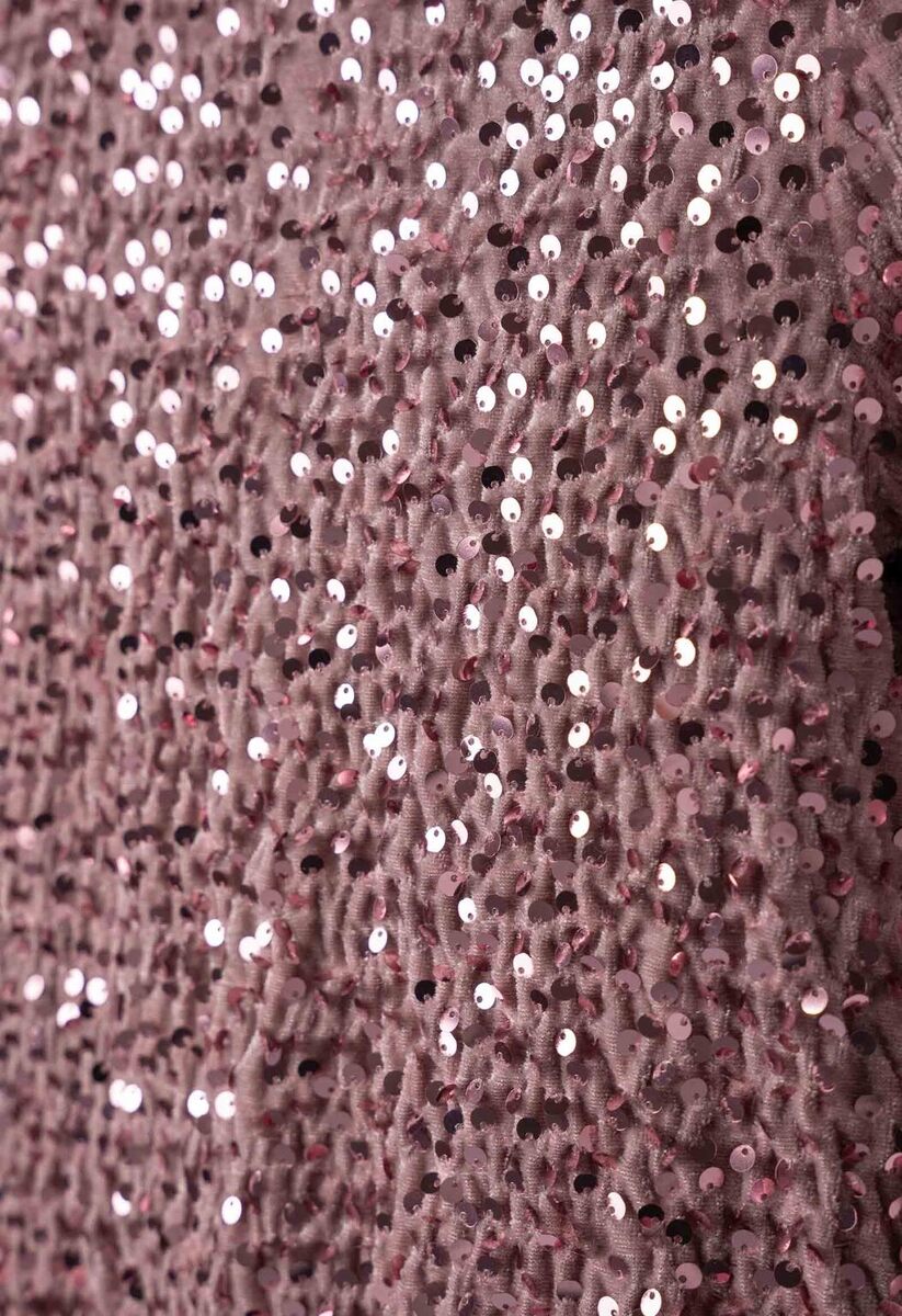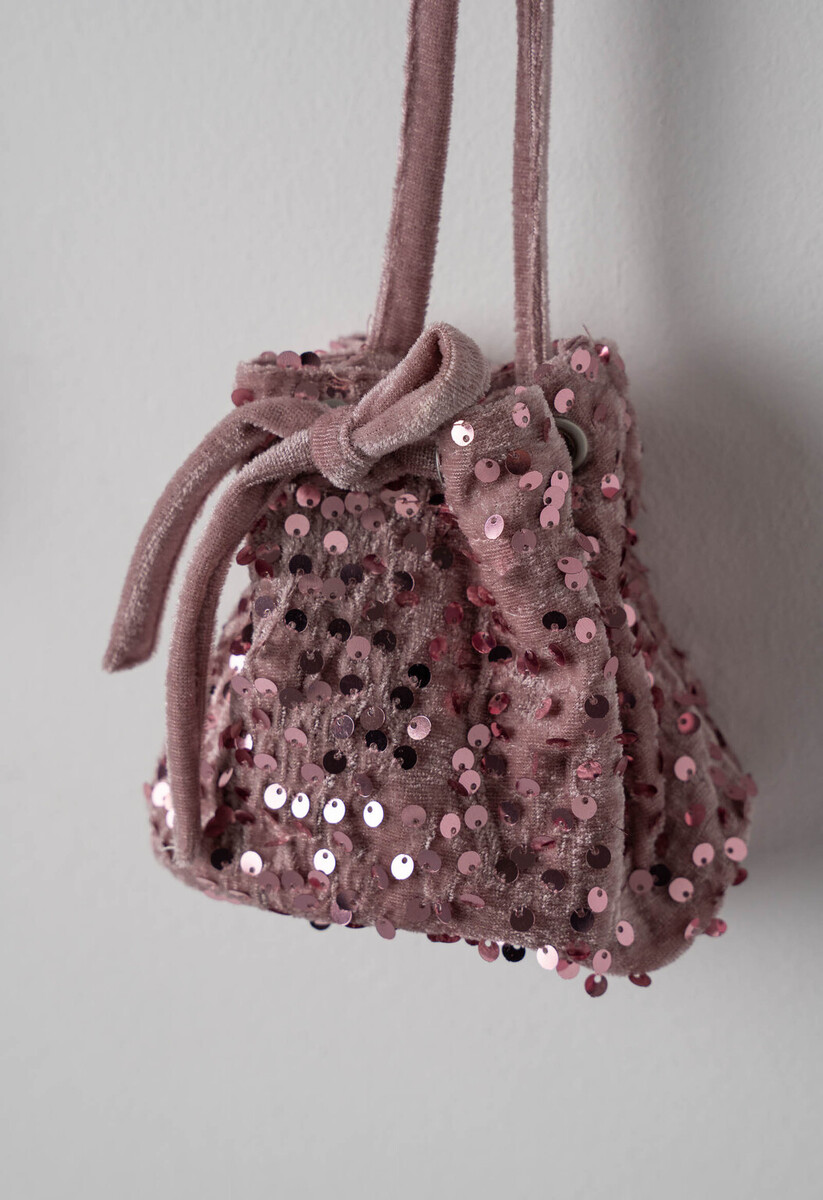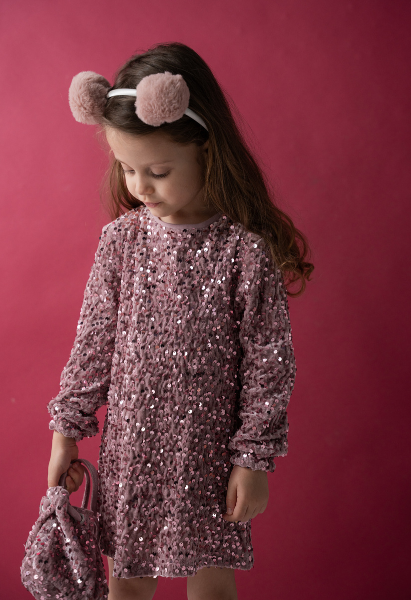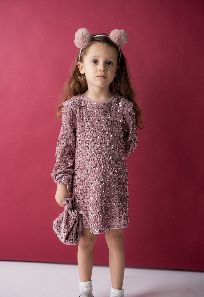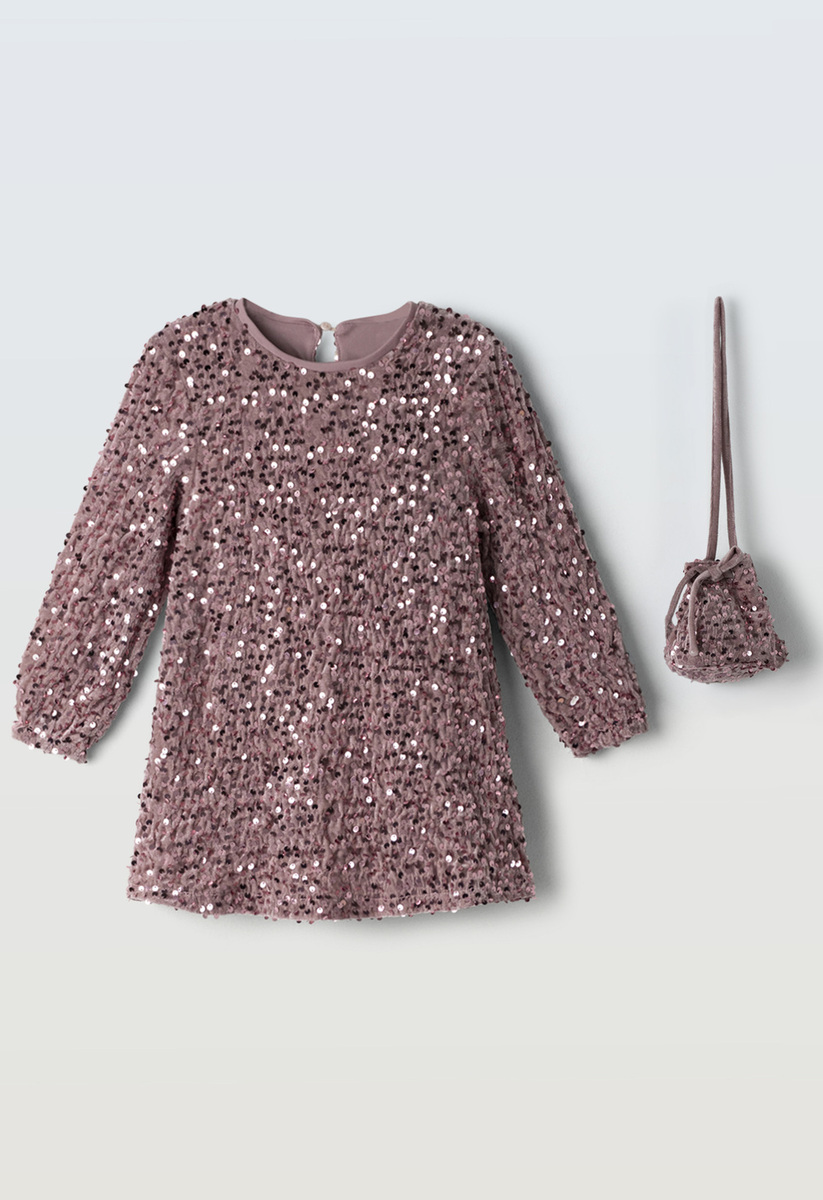 Βελουτέ φόρεμα ΕΒΙΤΑ σε ροζ σκούρο χρώμα με παγιέτες, φόδρα στο εσωτερικό, ελαστικό τελείωμα στα μανίκια, κούμπωμα με κουμπάκι στην πλάτη και ασορτί τσαντάκι.