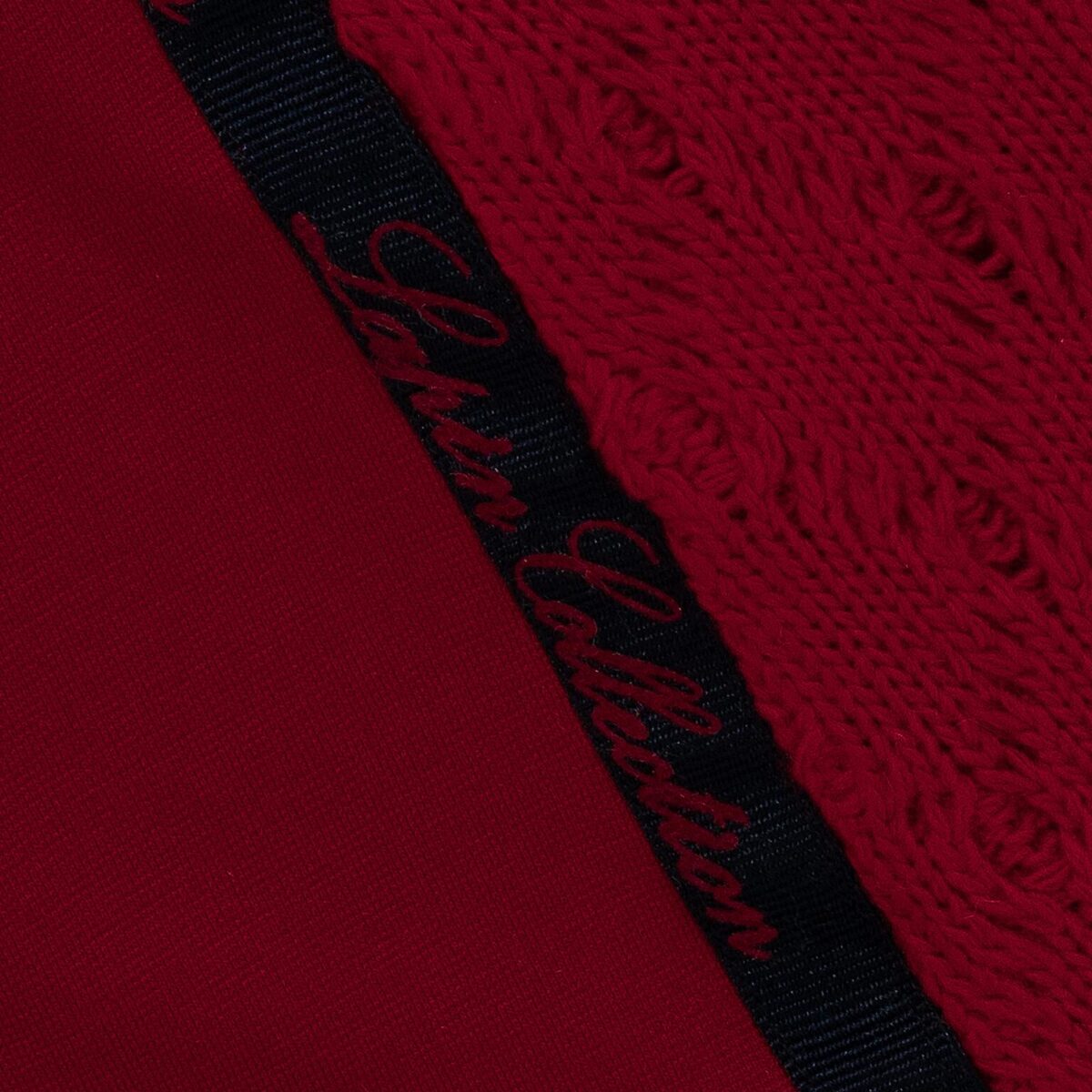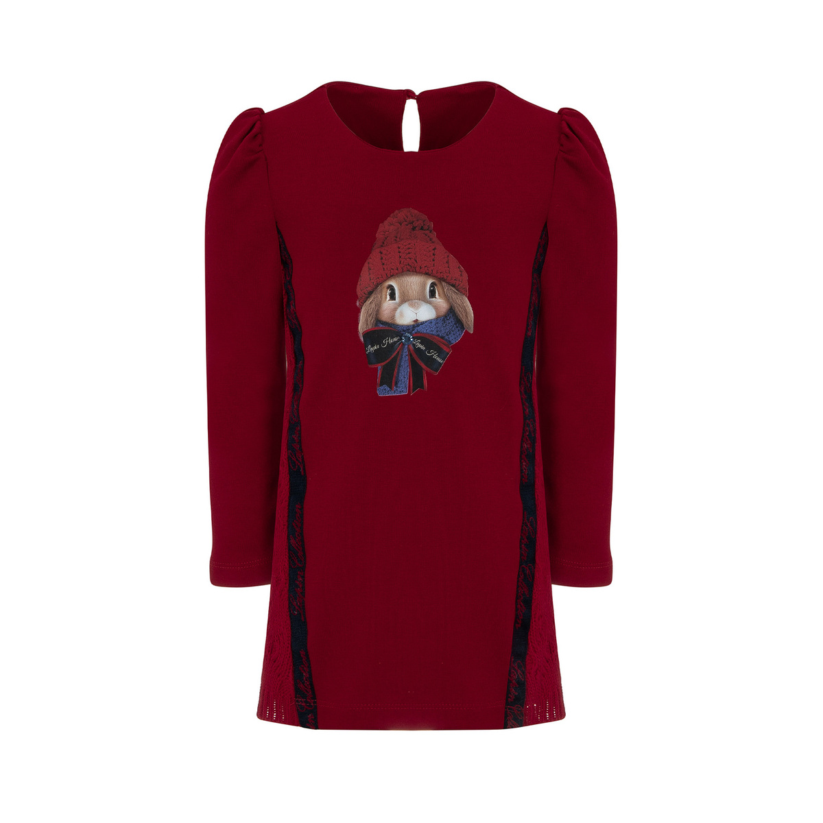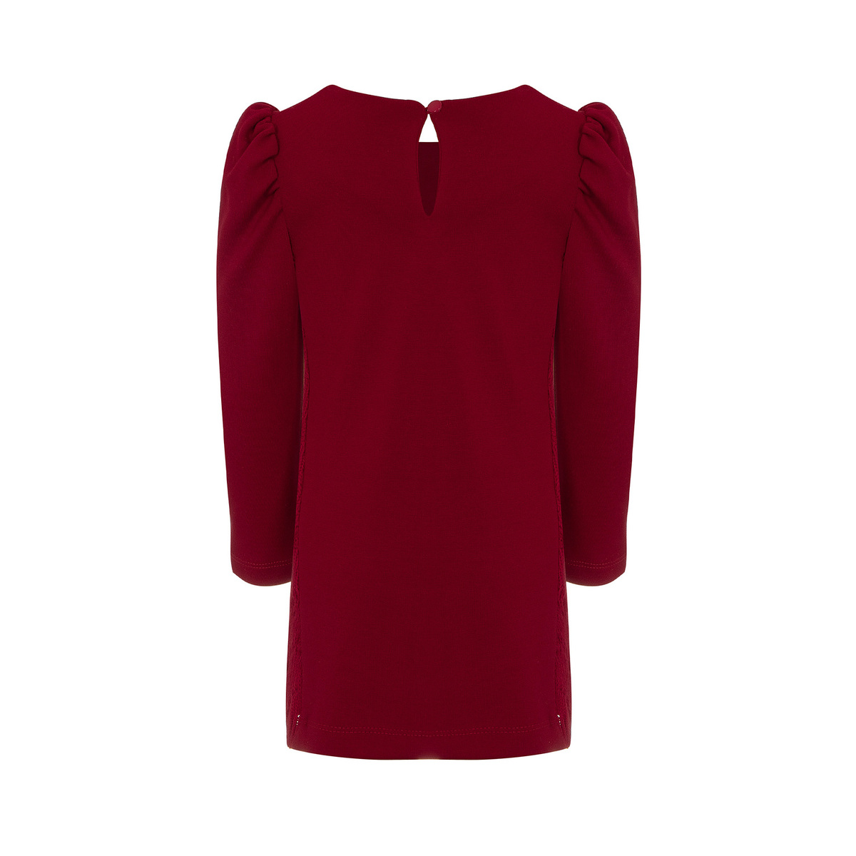 Φόρεμα LAPIN HOUSE σε κόκκινο χρώμα με στρογγυλή λαιμόκοψη, όγκο στους ώμους, λεπτομέρεια από δαντέλα στο πλάι και κούμπωμα με κουμπί στην πλάτη.