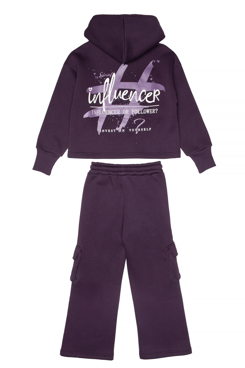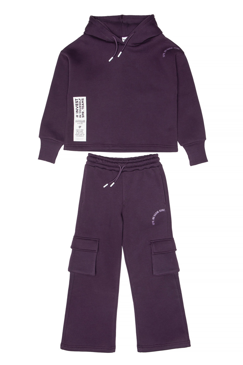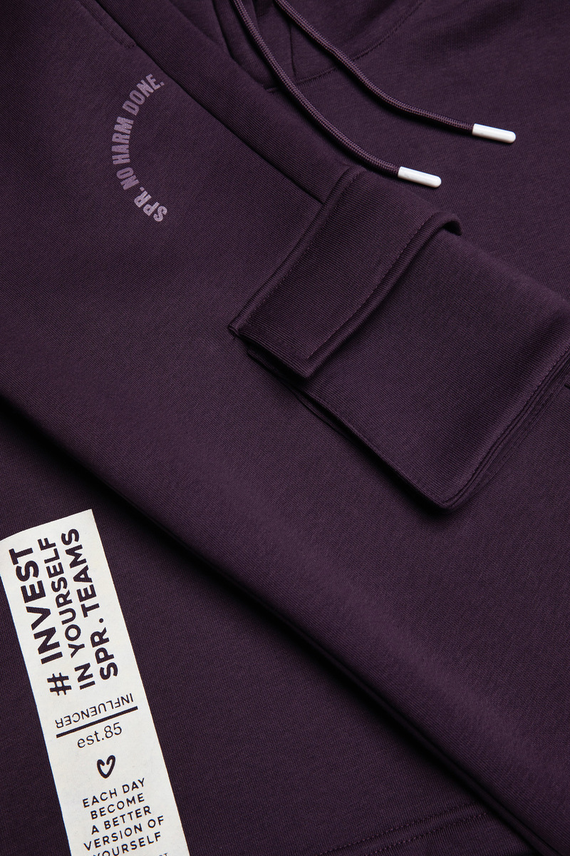 Σετ φόρμας SPRINT σε μωβ σκούρο χρώμα, μπλούζα φούτερ με ενσωματωμένη κουκούλα και παντελόνι φούτερ με λάστιχο, ανεξάρτητο εσωτερικό κορδόνι στη μέση και δύο εξωτερικές τσέπες στο πλάι.