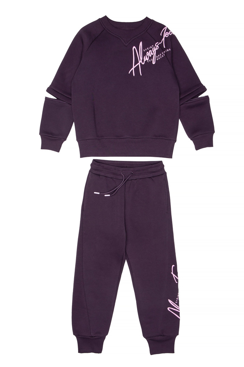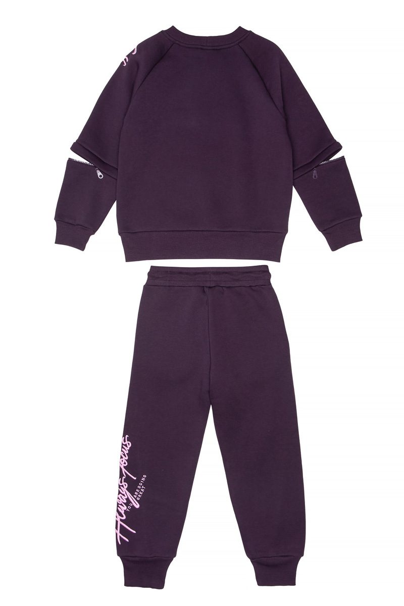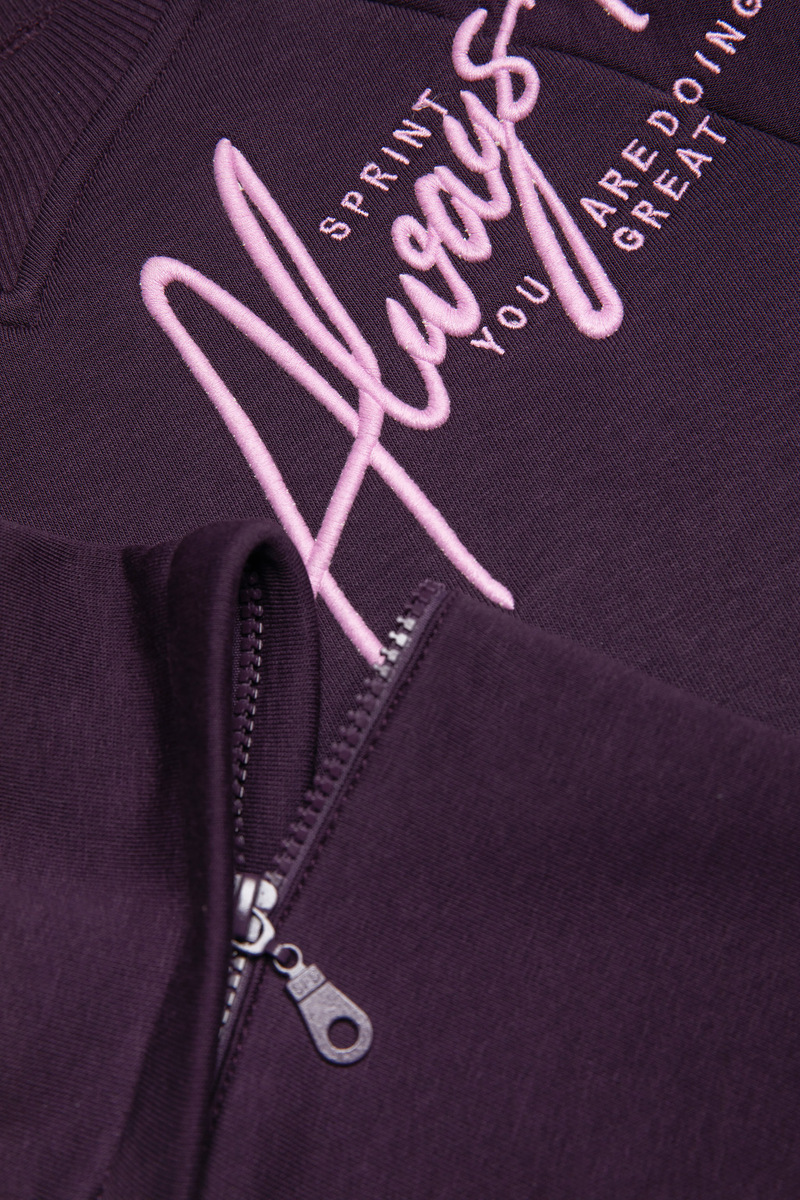 Σετ φόρμας SPRINT σε μωβ σκούρο χρώμα, μπλούζα φούτερ με στρογγυλή λαιμόκοψη, άνοιγμα με φερμουάρ στα μανίκια και παντελόνι φούτερ με λάστιχο και ανεξάρτητο εσωτερικό κορδόνι στη μέση.