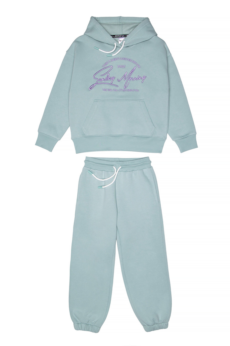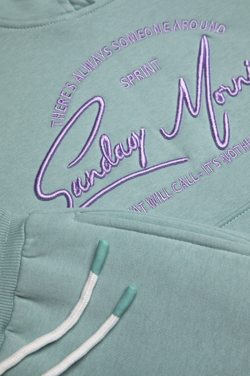 Σετ φόρμας SPRINT σε χρώμα μέντα, μπλούζα φούτερ με ενσωματωμένη κουκούλα και παντελόνι φούτερ με λάστιχο και ανεξάρτητο εσωτερικό κορδόνι στη μέση.