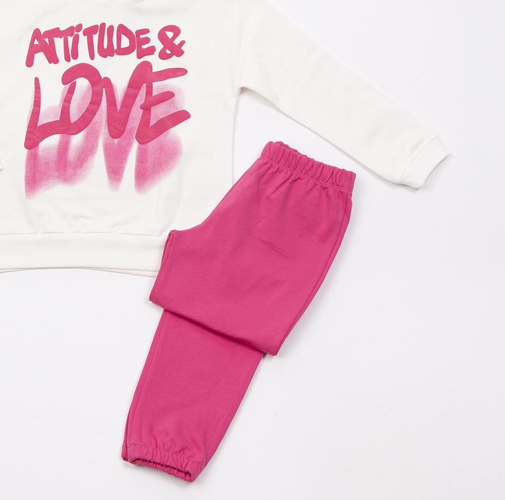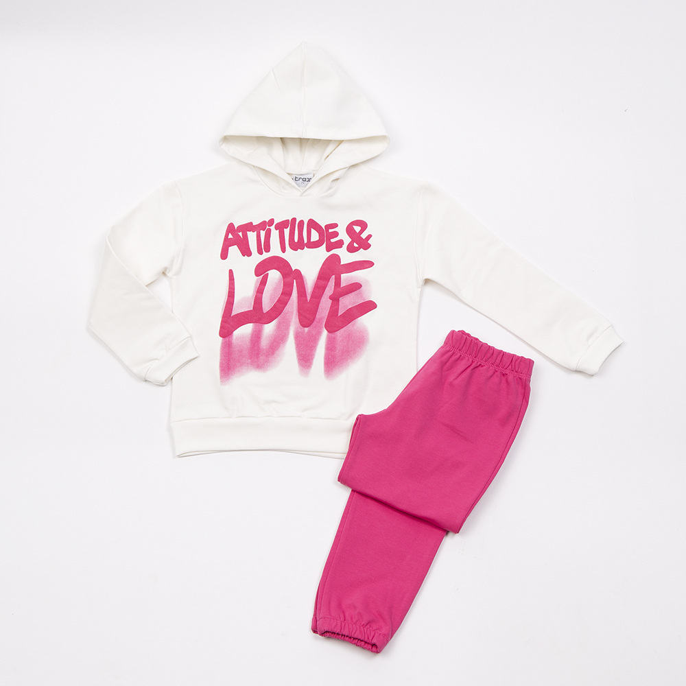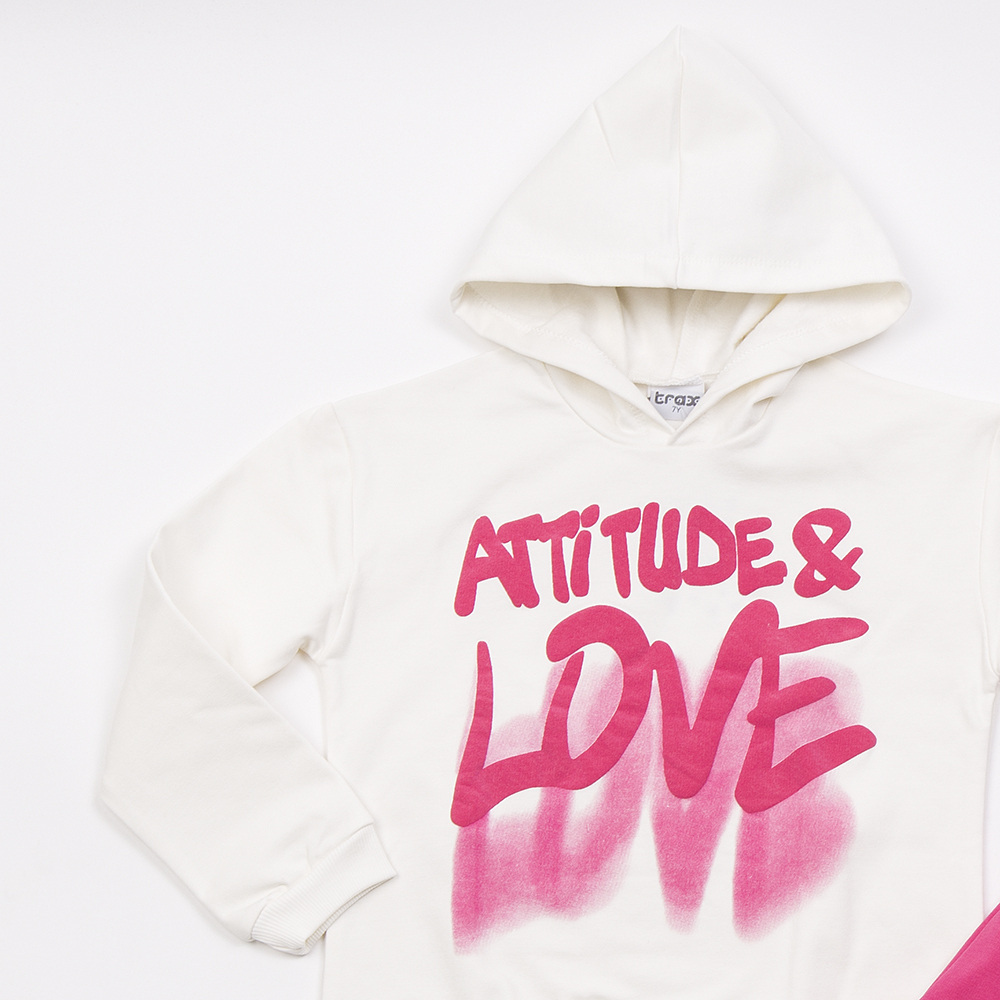 Σετ φόρμας TRAX, μπλούζα φούτερ με κουκούλα σε εκρού χρώμα και παντελόνι φούτερ με λάστιχο στη μέση και το τελείωμα σε χρώμα φούξια.