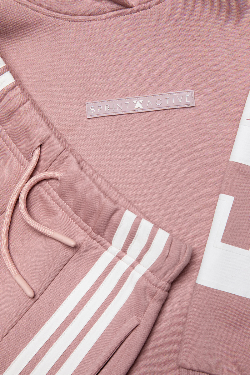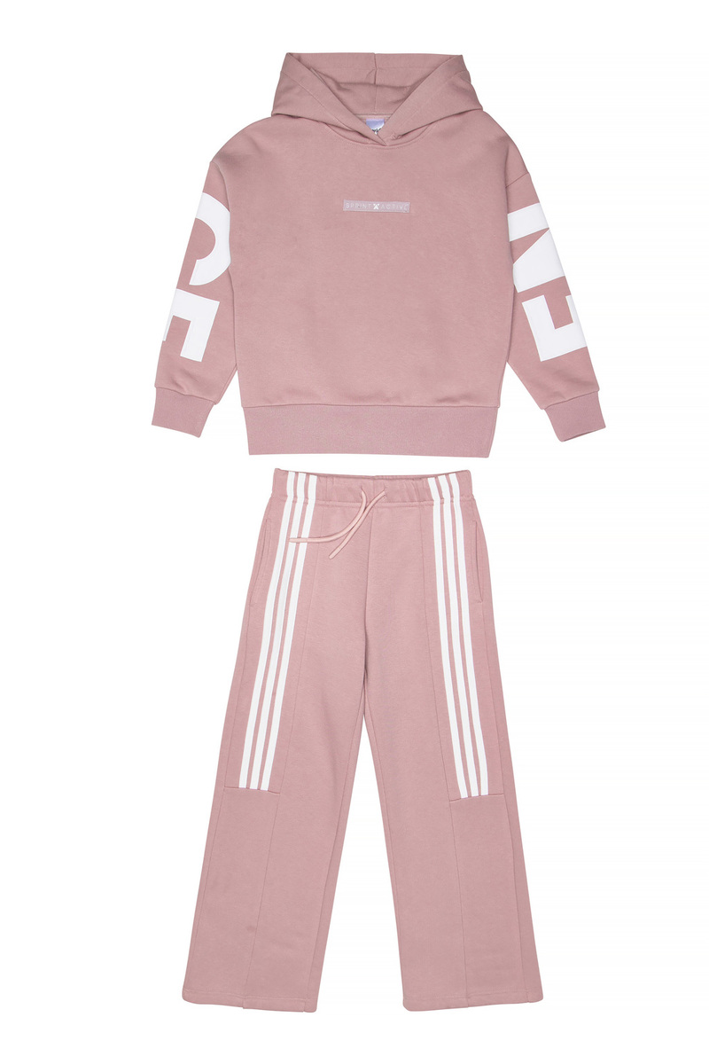 Σετ φόρμας SPRINT σε ροζ χρώμα, μπλούζα φούτερ με ενσωματωμένη κουκούλα, ριπ λάστιχο στα μανίκια και το τελείωμα και παντελόνι φούτερ σε φαρδιά γραμμή με λάστιχο και ανεξάρτητο εσωτερικό κορδόνι στη μέση.