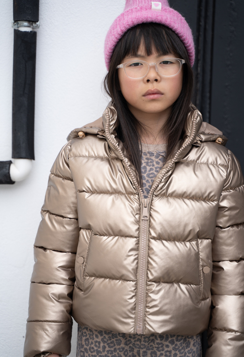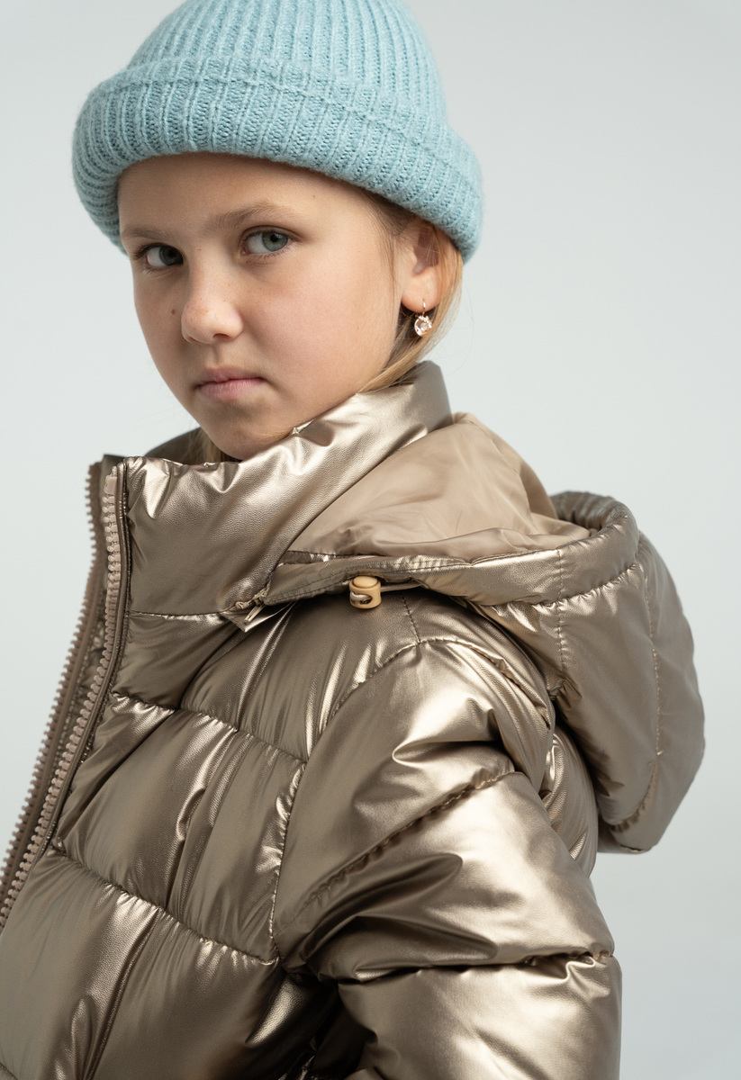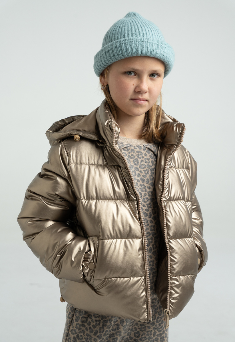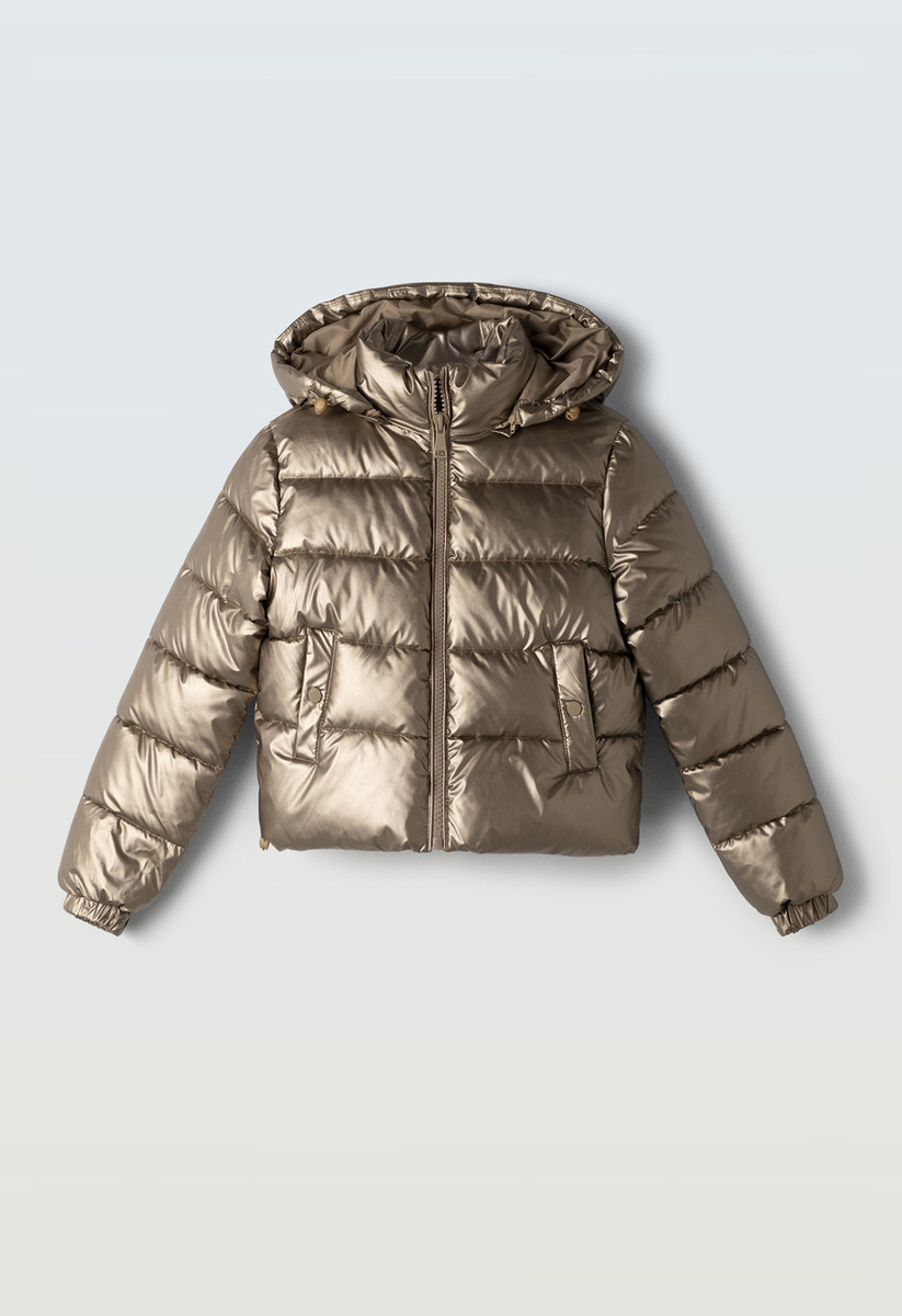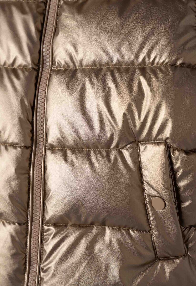 Μπουφάν ΕΒΙΤΑ σε χρυσό χρώμα με αποσπώμενη κουκούλα, ψηλό λαιμό, κούμπωμα με φερμουάρ και λάστιχο στα μανίκια και το τελείωμα.