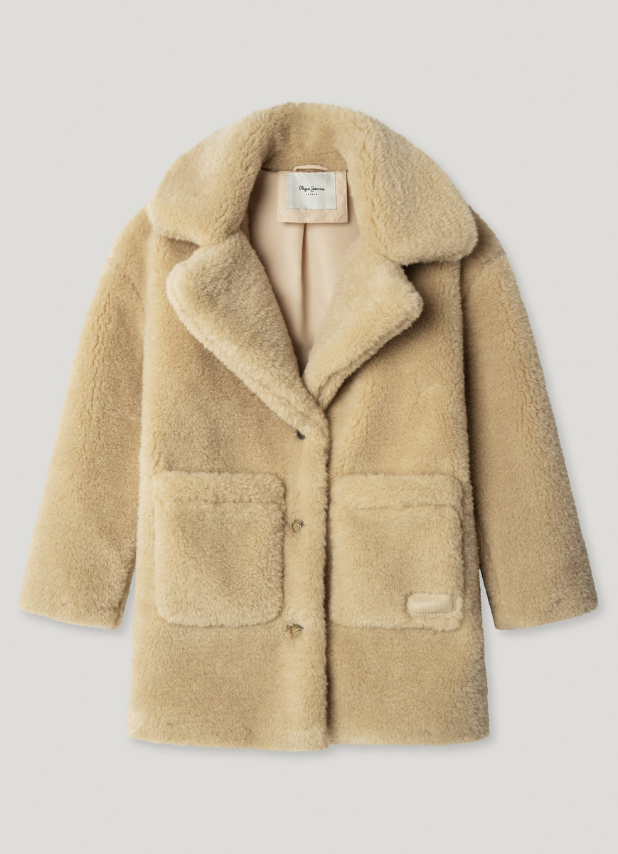 Γούνινο παλτό PEPE JEANS σε μπεζ χρώμα με γιακά, κούμπωμα με κουμπιά, δύο εξωτερικές τσέπες στο μπροστινό μέρος και logo print στο τελείωμα.