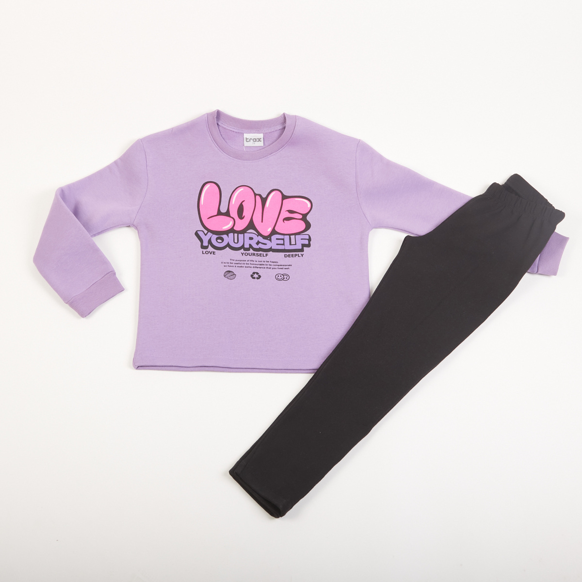 Σετ κολάν TRAX, μπλούζα φούτερ με στρογγυλή λαιμόκοψη σε λιλά χρώμα και κολάν με λάστιχο στη μέση σε χρώμα μαύρο.