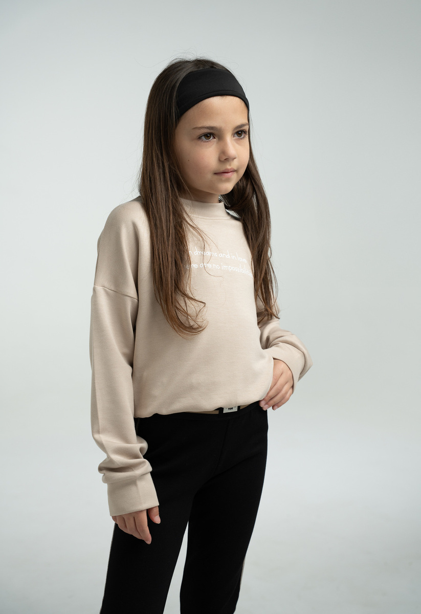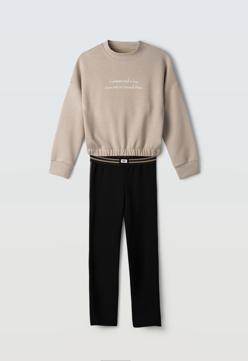 Σετ κολάν ΕΒΙΤΑ, μπλούζα φούτερ με στρογγυλή λαιμόκοψη σε μπεζ χρώμα και κολάν βαμβακερό - ελαστικό, με λάστιχο στη μέση, σε χρώμα μαύρο.