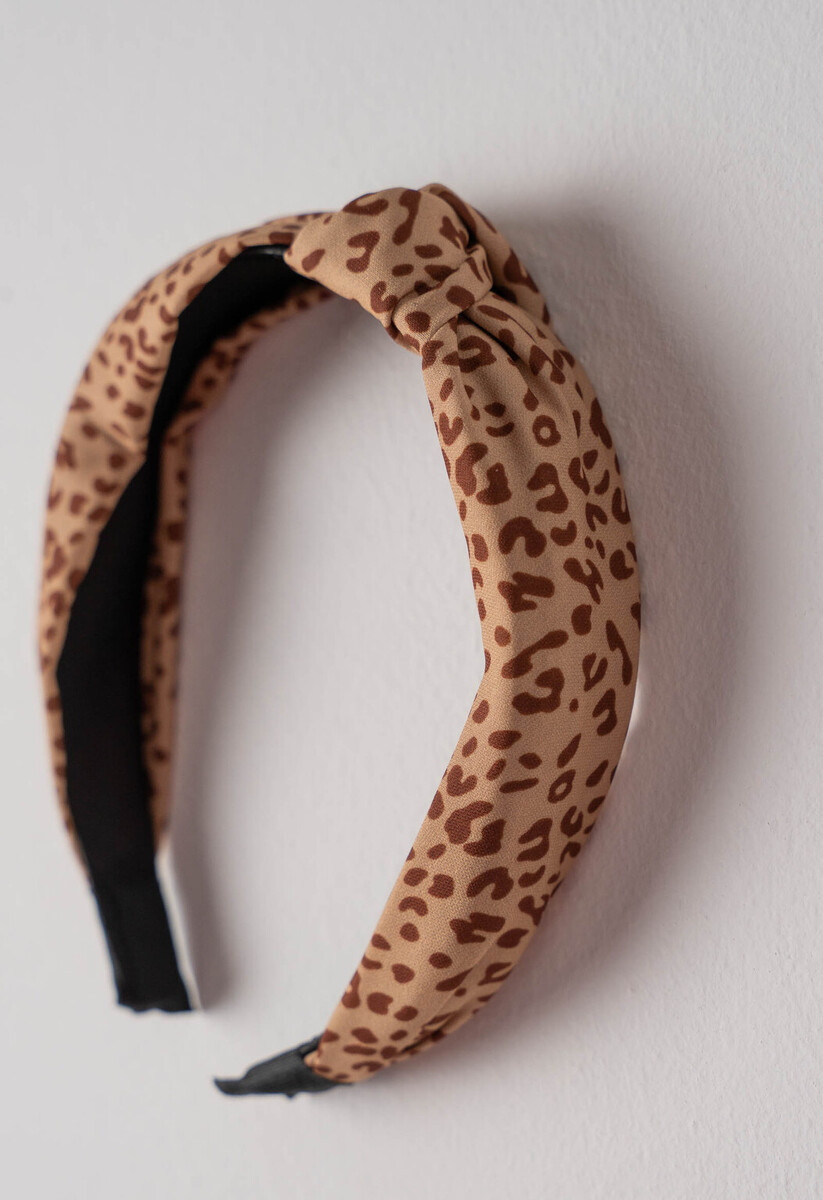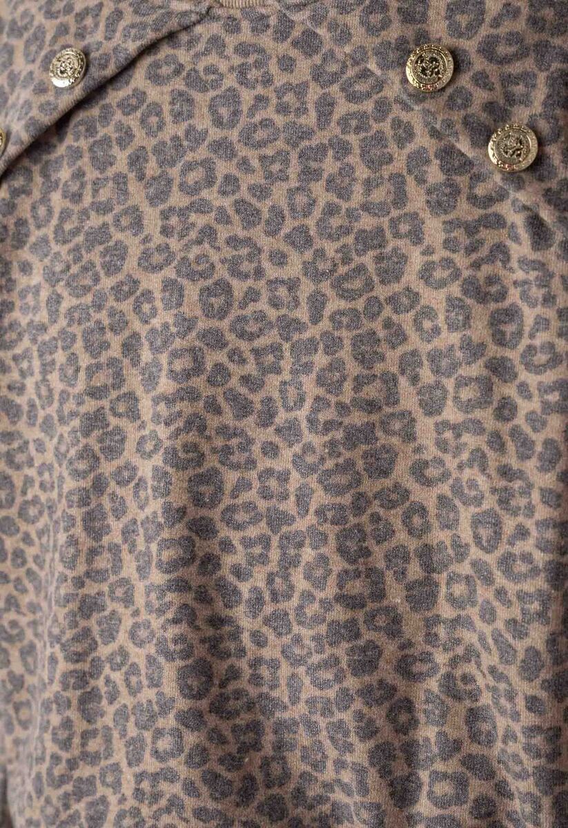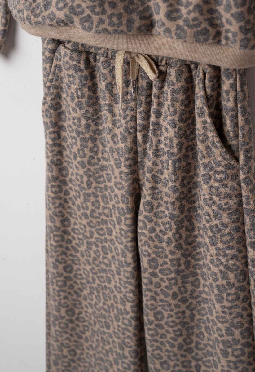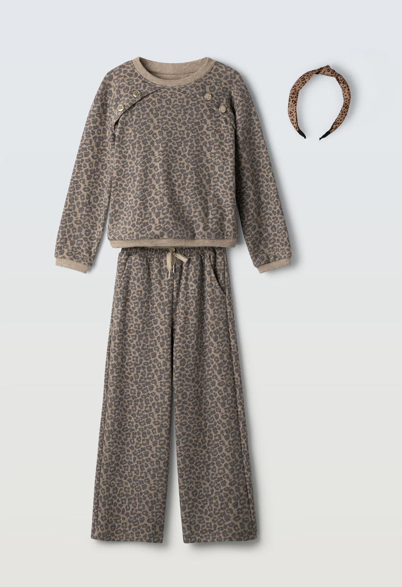 Σετ μπλούζα με παντελόνα ΕΒΙΤΑ σε μπεζ χρώμα με all over animal print, μπλούζα με στρογγυλή λαιμόκοψη και μεταλλικά κουμπιά, παντελόνα σε φαρδιά γραμμή με λάστιχο στη μέση και δύο εσωτερικές τσέπες στο πλάι, ασορτί στέκα για τα μαλλιά.