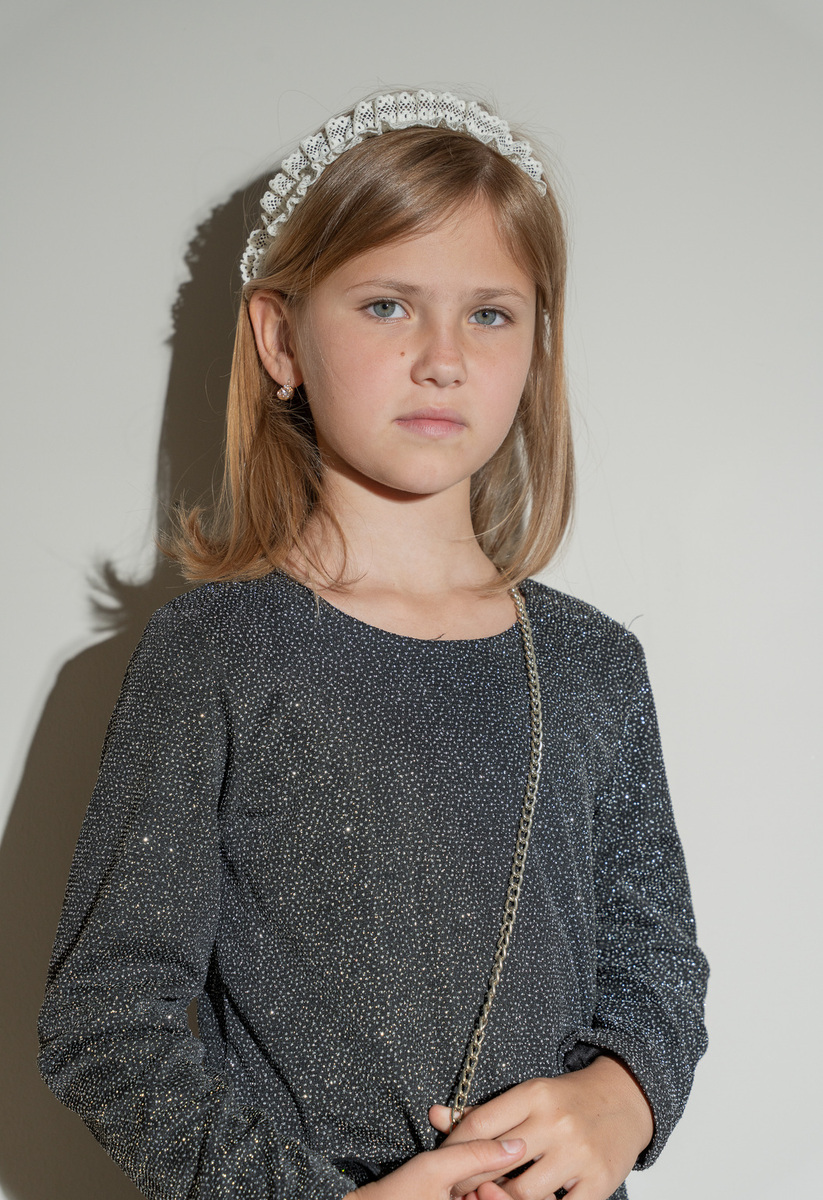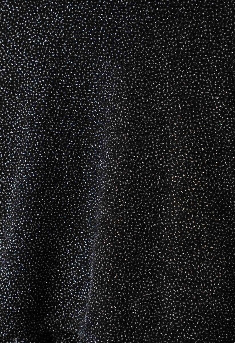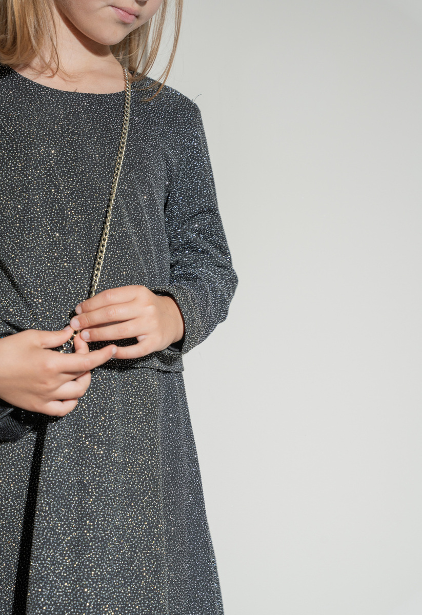 Φόρεμα ΕΒΙΤΑ σε μαύρο χρώμα με γκλίτερ, στρογγυλή λαιμόκοψη, φόδρα στο εσωτερικό, κούμπωμα στην πλάτη και ασορτί τσαντάκι.