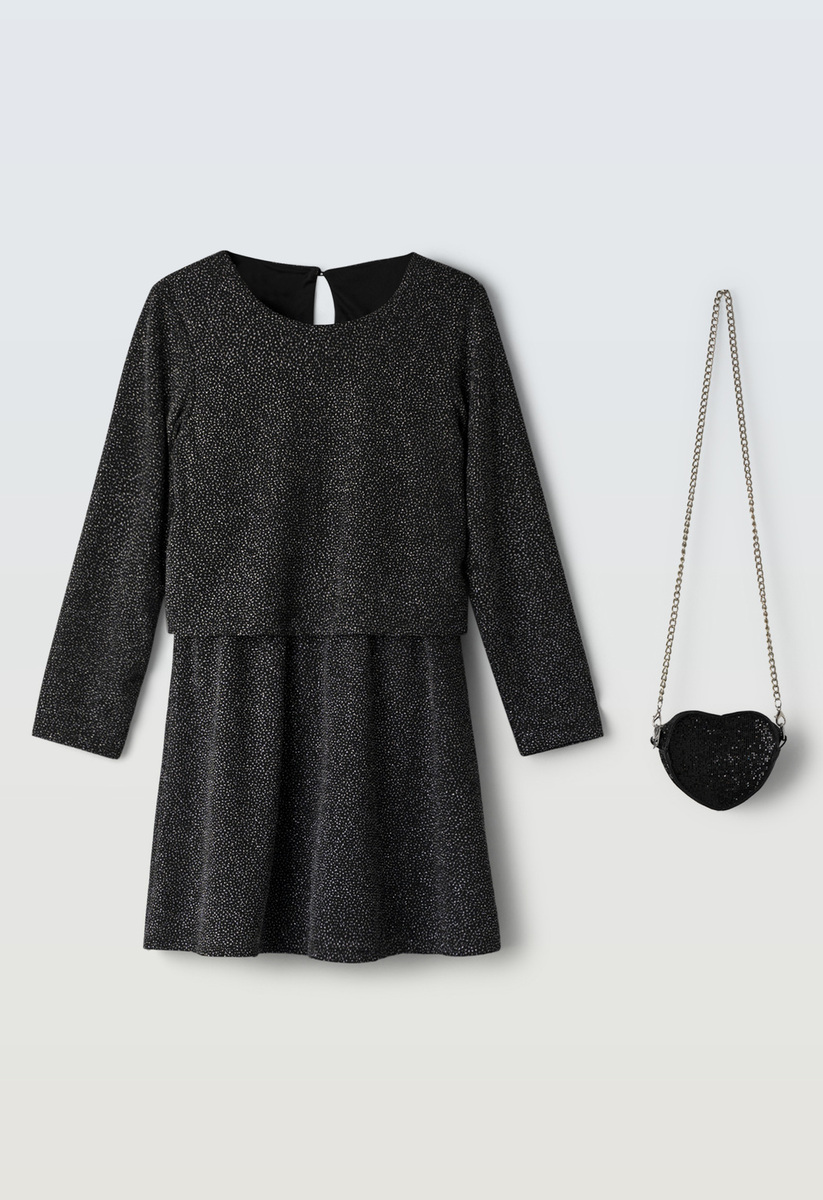 Φόρεμα ΕΒΙΤΑ σε μαύρο χρώμα με γκλίτερ και ασορτί τσαντάκι.