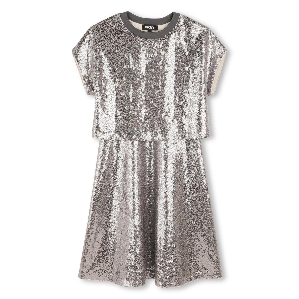 Φόρεμα D.K.N.Y. σε γκρι χρώμα με παγιέτες, στρογγυλή ελαστική λαιμόκοψη και logo print στο στήθος.