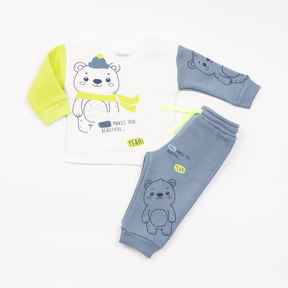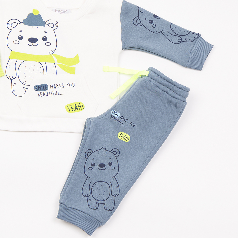 Σετ φόρμας TRAX, μπλούζα φούτερ σε εκρού χρώμα με στρογγυλή λαιμόκοψη, ανάγλυφο τύπωμα στο μπροστινό μέρος, κούμπωμα με κουμπιά στον ώμο για εύκολη εφαρμογή και παντελόνι φούτερ σε χρώμα πετρόλ με λάστιχο στη μέση και το τελείωμα.