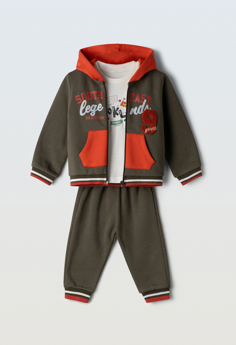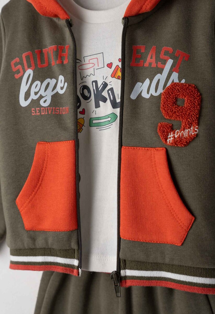 Σετ φόρμας 3 τεμ. HASHTAG σε χακί χρώμα, ζακέτα φούτερ με ενσωματωμένη κουκούλα, μπλούζα μακρυμάνικη βαμβακερή σε εκρού χρώμα με στρογγυλή λαιμόκοψη και παντελόνι φούτερ με λάστιχο στη μέση και το τελείωμα.