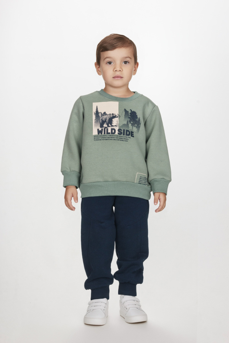 Σετ φόρμας JOYCE, μπλούζα φούτερ σε βεραμάν χρώμα με στρογγυλή λαιμόκοψη, ανάγλυφο τύπωμα στο μπροστινό μέρος και παντελόνι φούτερ σε χρώμα μπλε με λάστιχο στη μέση και το τελείωμα.