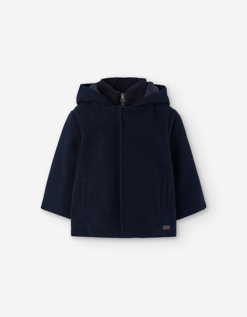 Παλτό LOSAN σε μπλε σκούρο χρώμα με ενσωματωμένη κουκούλα, ψηλό λαιμό, φόδρα στο εσωτερικό και διπλό κούμπωμα με φερμουάρ και τρουκς.