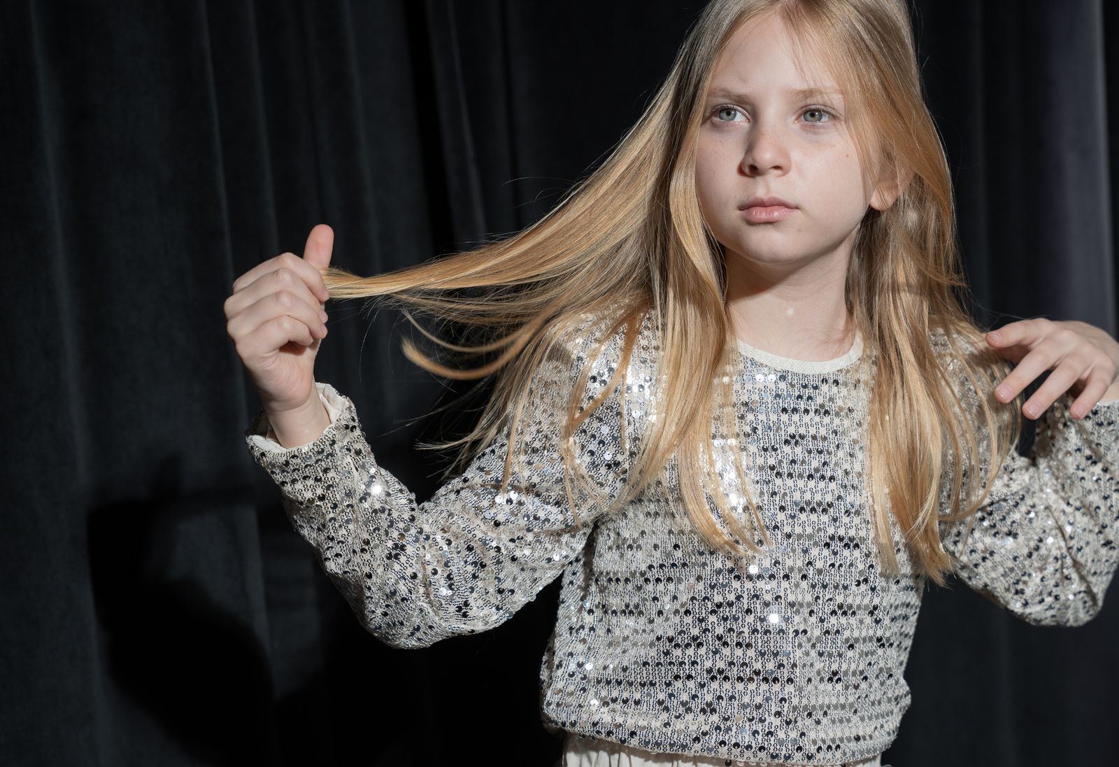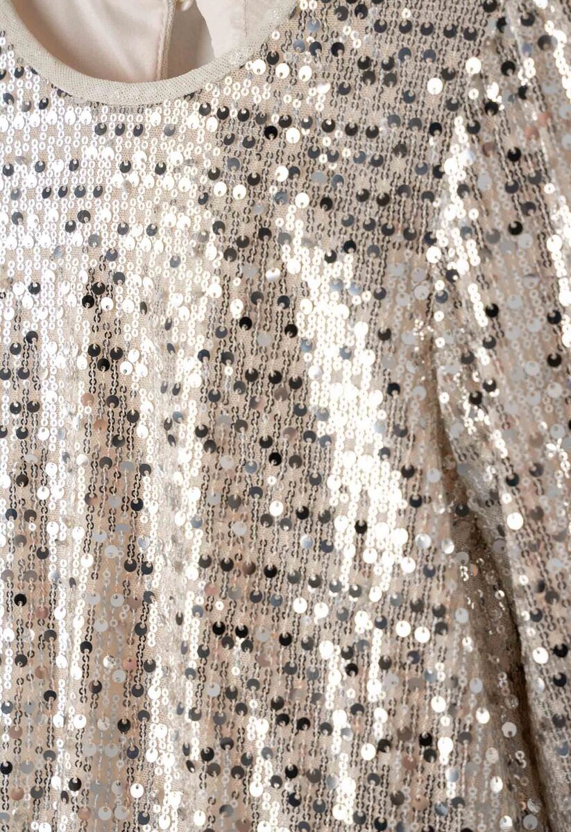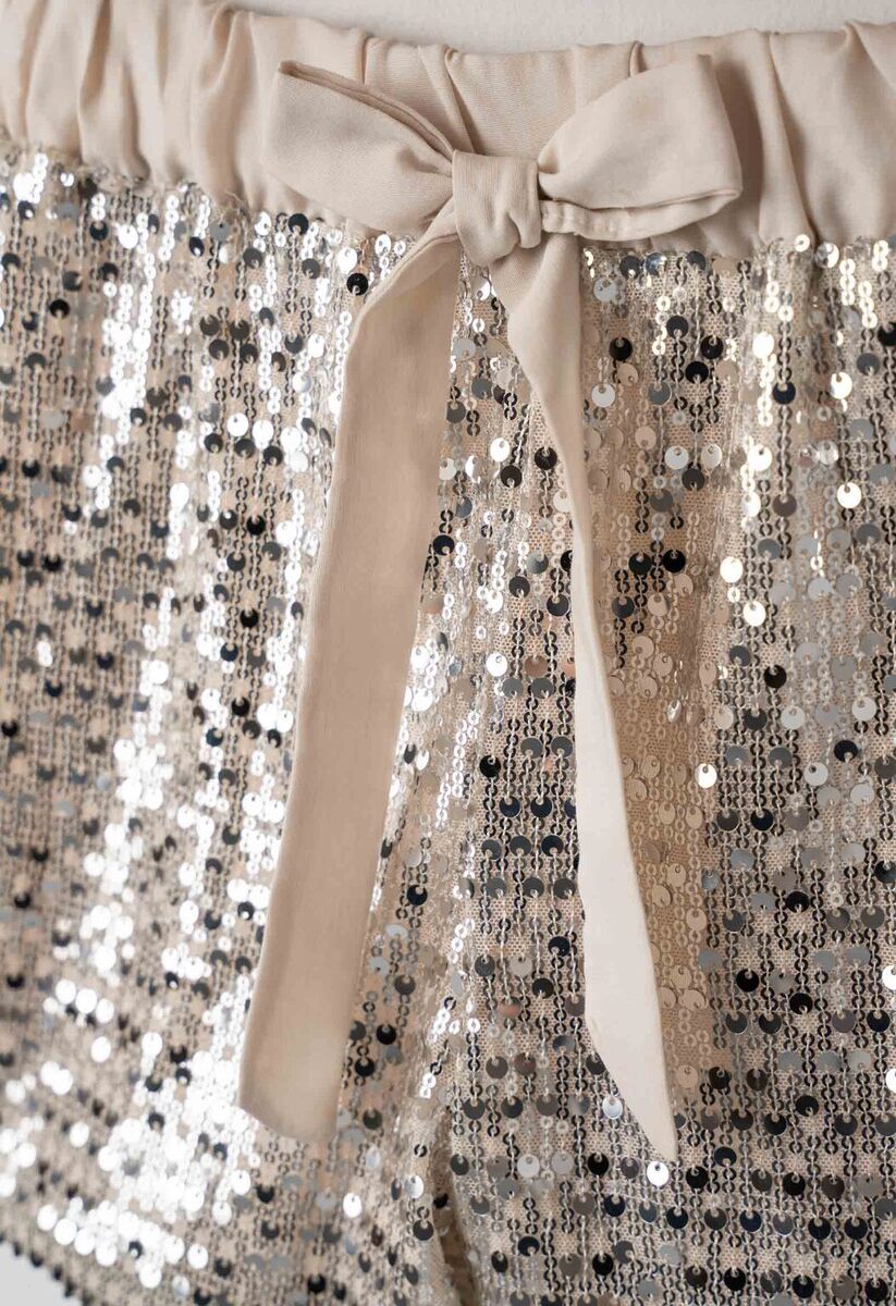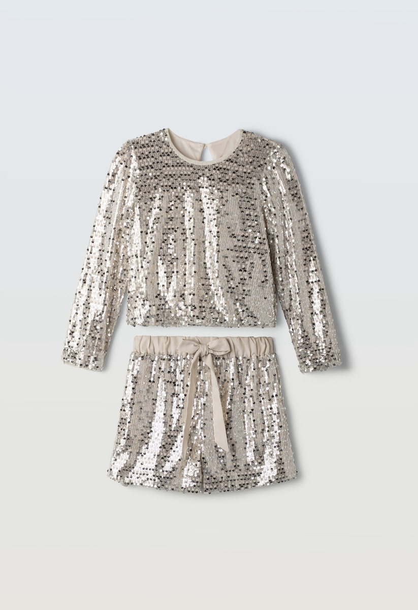Σετ σορτς ΕΒΙΤΑ σε μπεζ σαμπανιζέ χρώμα με παγιέτες, μπλούζα με στρογγυλή λαιμόκοψη, κούμπωμα στην πλάτη και σορτς με λάστιχο στη μέση και φόδρα στο εσωτερικό.